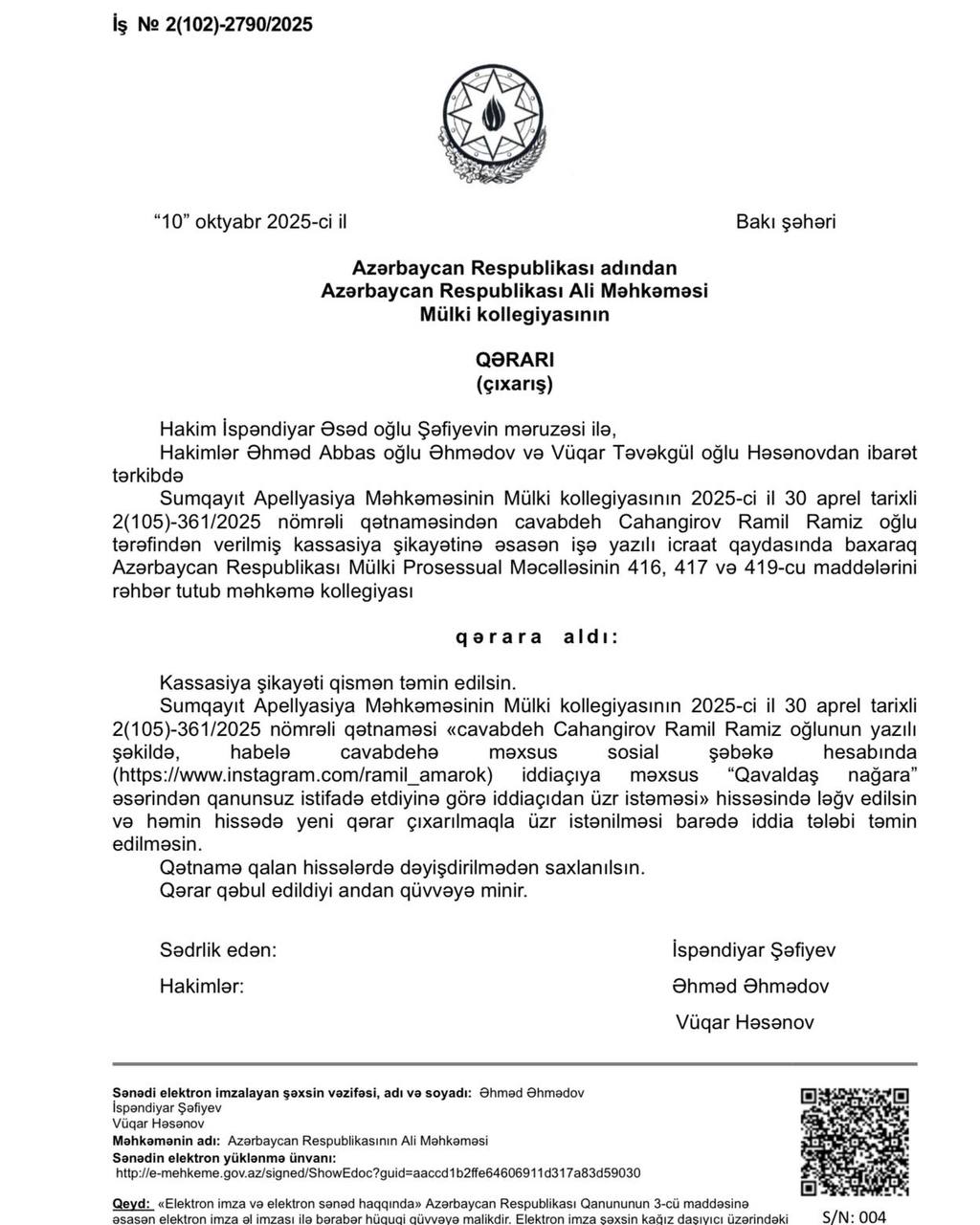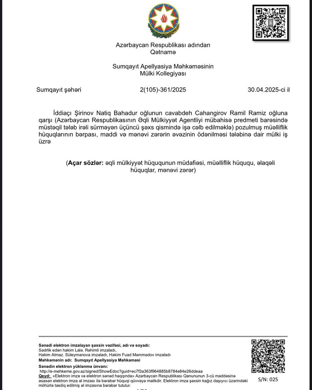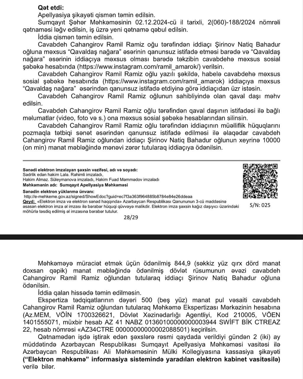 Məhkəmə yalnız “üzr istəmə” bəndini ləğv edib. Qalan bütün hissələr - cərimə, Qavaldaşın məhv edilməsi və müəlliflik hüquqlarının bərpası - qüvvədə saxlanılıb. Mən susuram, çünki ədalət artıq danışıb. Həqiqət gizlədilə bilər, amma inkar edilə bilməz.