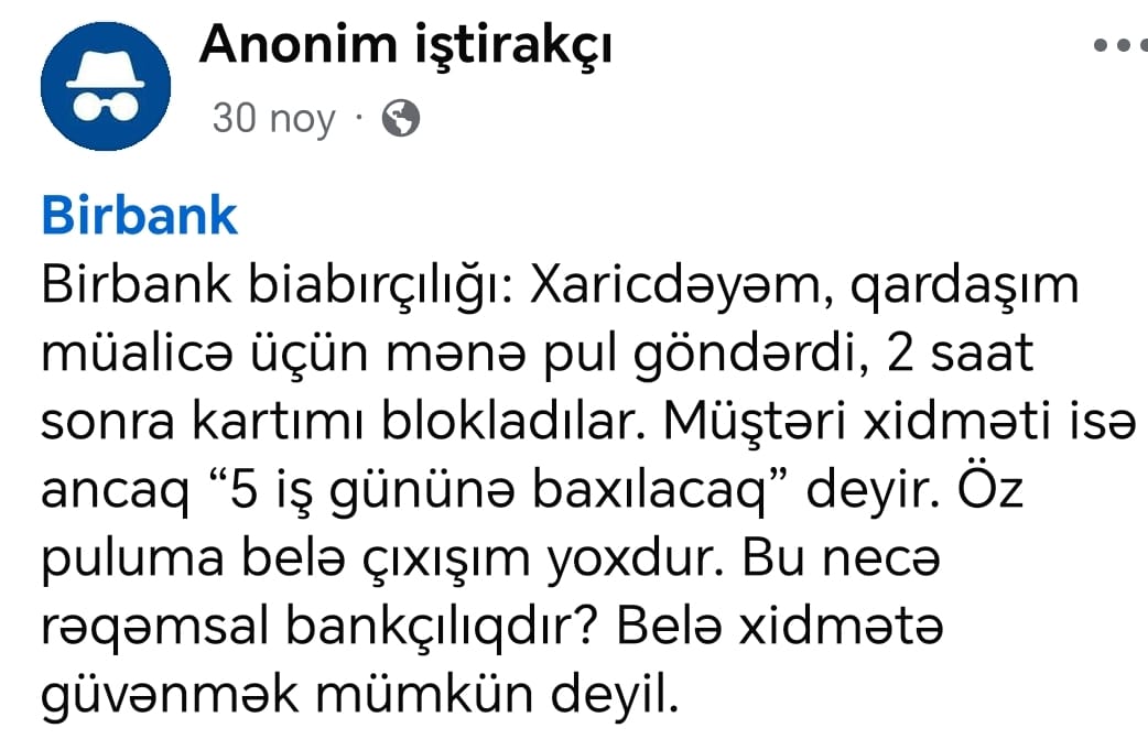 “Birbank” istifadəçisi xaricdə olarkən qarşılaşdığı problemlə bağlı narazılığını ictimailəşdirib. Müştərinin sözlərinə görə, müalicə xərcləri üçün qardaşı tərəfindən göndərilən puldan cəmi iki saat sonra bank kartı bloklanıb və o, vəsaitinə çıxış imkanını tamamilə itirib.