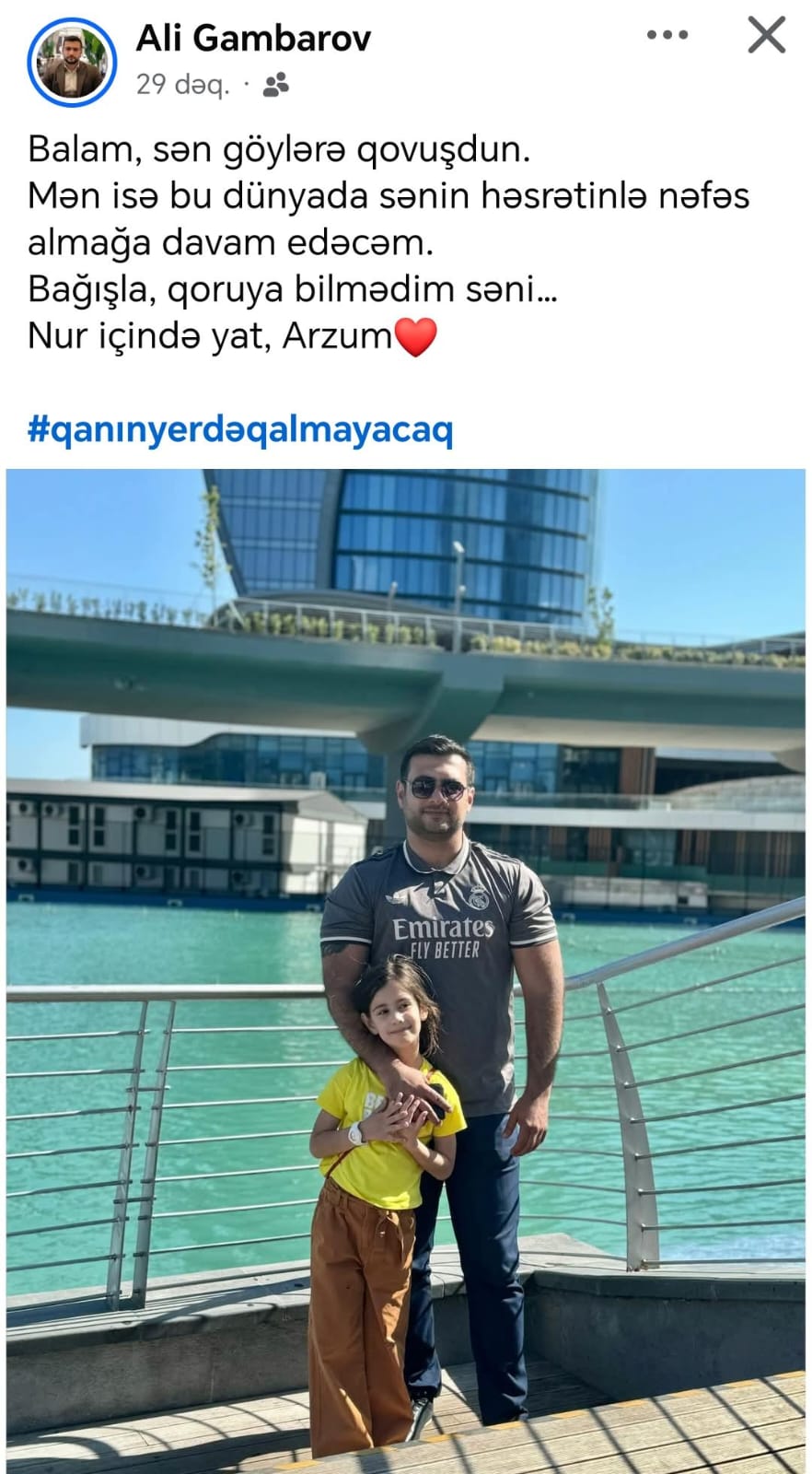 Tribuna-nın məlumatına görə, Ə. Qəmbərov qızı ilə bağlı statusu “qanın yerdə qalmayacaq” həştəqi ilə paylaşıb: