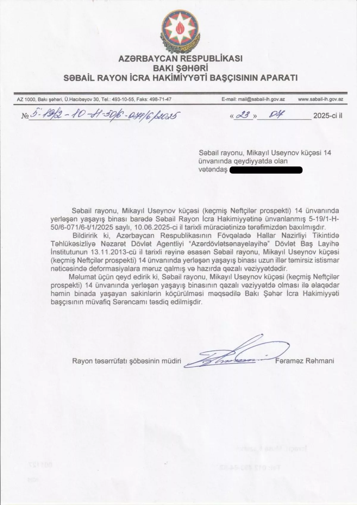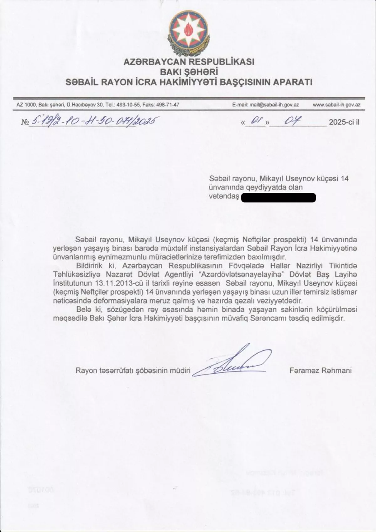 Исполнительная власть Сабаильского района Баку, в свою очередь, подтвердила факт встречи с жильцами, отметив, что здание №14 по улице Микаила Усейнова из-за долгого отсутствия ремонта признано аварийным,
