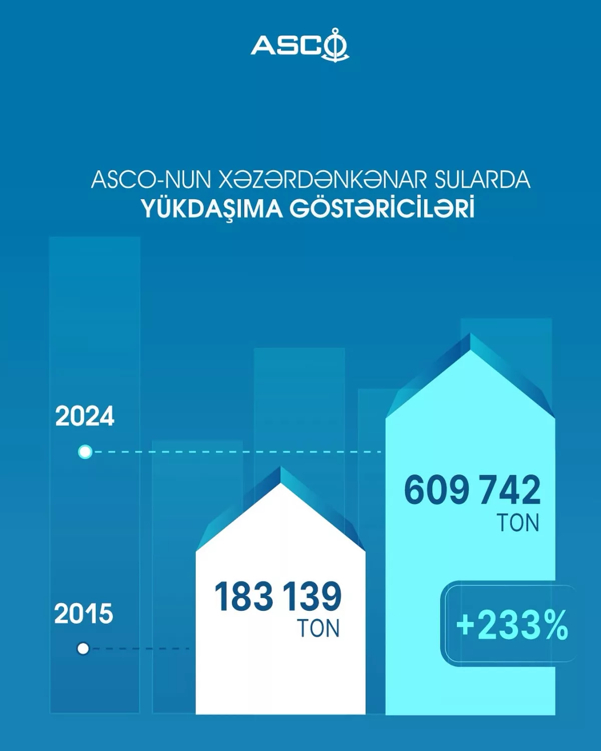 «Если в 2015 году за пределами Каспия судами ASCO было перевезено 183 139 тонн грузов, то в 2024 - 609 742 тонн. Это означает рост в 3,3 раза, или на 233%», - отметил М. Мехдиев.