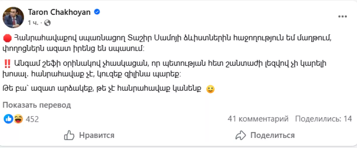 «Желаю успеха формалистам Ташира Само (арестованный олигарх Самвел Карапетян — ред.), которые грозятся выйти на митинг, свободные улицы их ждут.