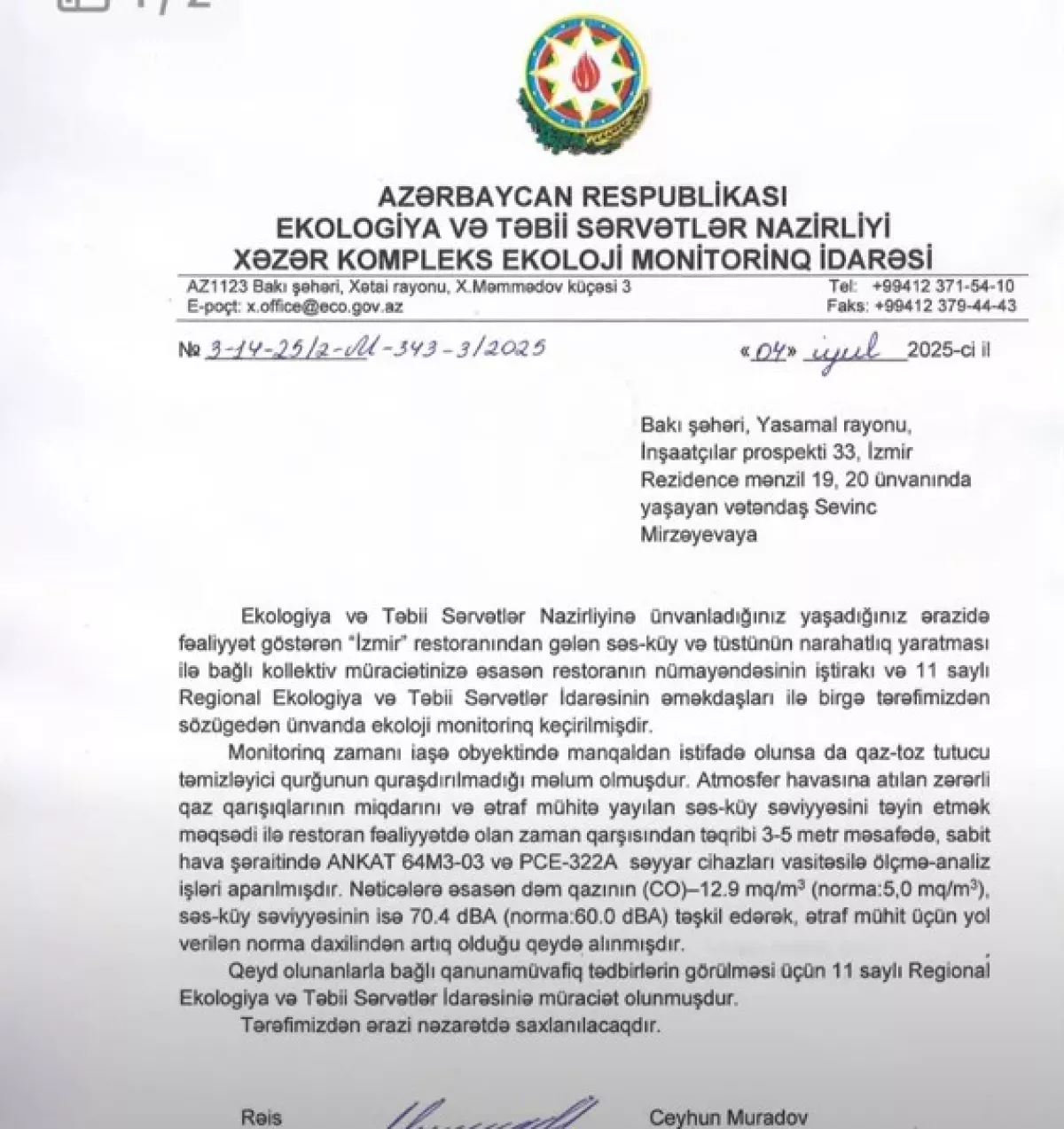 Напомним, что судебное противостояние жильцов и ресторана началось в 2024 году. Тогда Ясамальский районный суд обязал ресторан не превышать максимальный уровень шума в 60 децибел с 07:00 до 23:00, а после 23:00 полностью прекращать трансляцию музыки. Ресторан подал апелляционную жалобу на постановление суда, но Бакинский апелляционный суд, как мы видим, отклонил ее, оставив в силе решение суда первой инстанции.