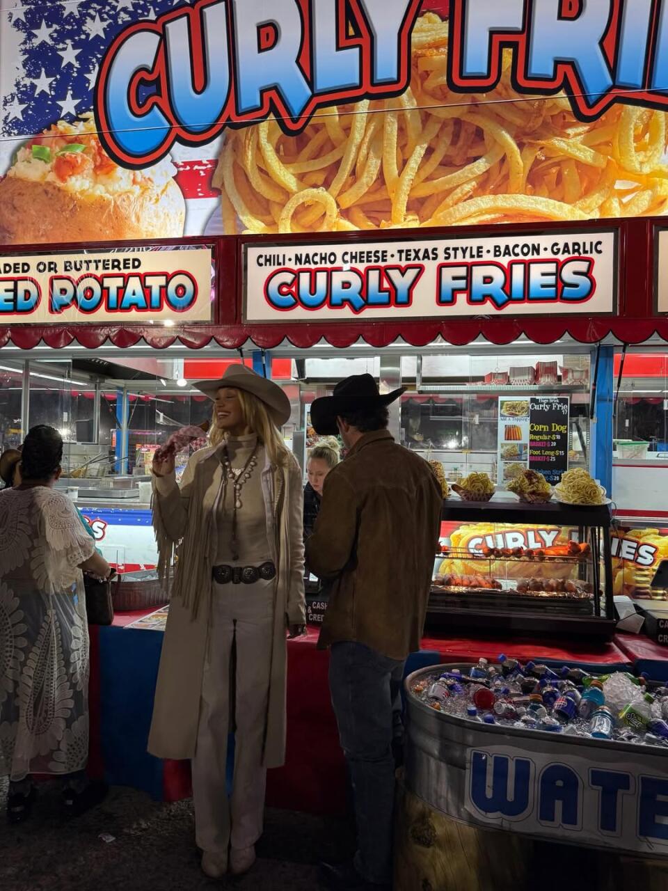 Модель добавила к образу массивное украшение. Она была запечатлена с распущенными волосами и макияжем в естественном стиле. Рядом стоял ее возлюбленный Адан Бануэлос в ковбойской одежде. Влюбленные покупали фаст-фуд.