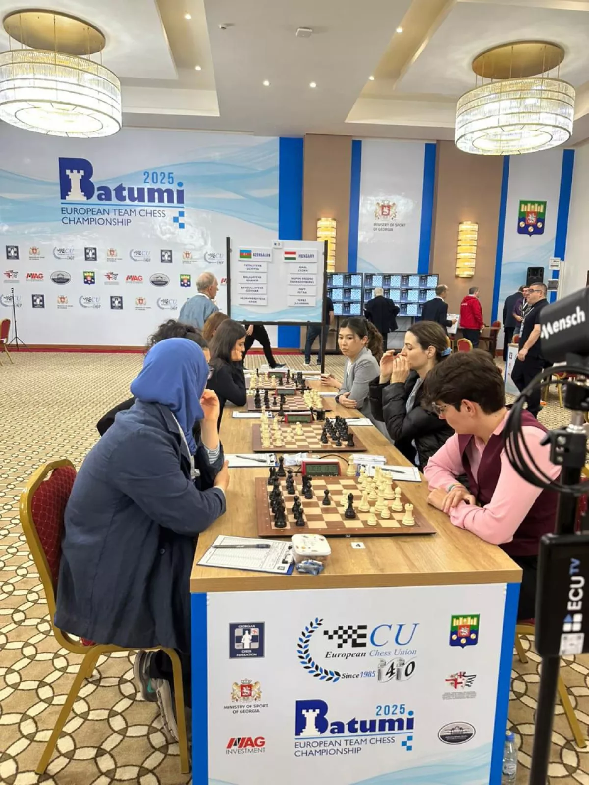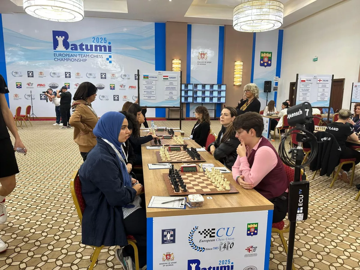 Женская сборная Азербайджана во втором туре обыграла команду Венгрии со счетом 2,5:1,5. Ульвия Фаталиева и Аян Аллахвердиева добились побед, Говхар Бейдуллаева сыграла вничью, а Ханым Балажаева потерпела поражение.