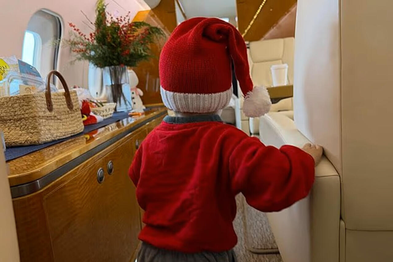 Годовалый Джек Блюз был запечатлен в вязаной шапочке Санты, красном свитере и серых брюках. Сын певца и модели стоял спиной к камере и смотрел на салон частного самолета.