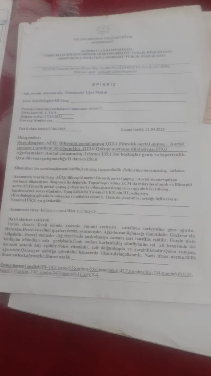 Как отмечает мать, диагноз Угура крайне серьезен - у мальчика недоразвит сосуд, ведущий от сердца к легким. По заключению врачей, после обязательной подготовки организма ему требуется сложнейшая операция, стоимость которой составляет 25 000 манатов.