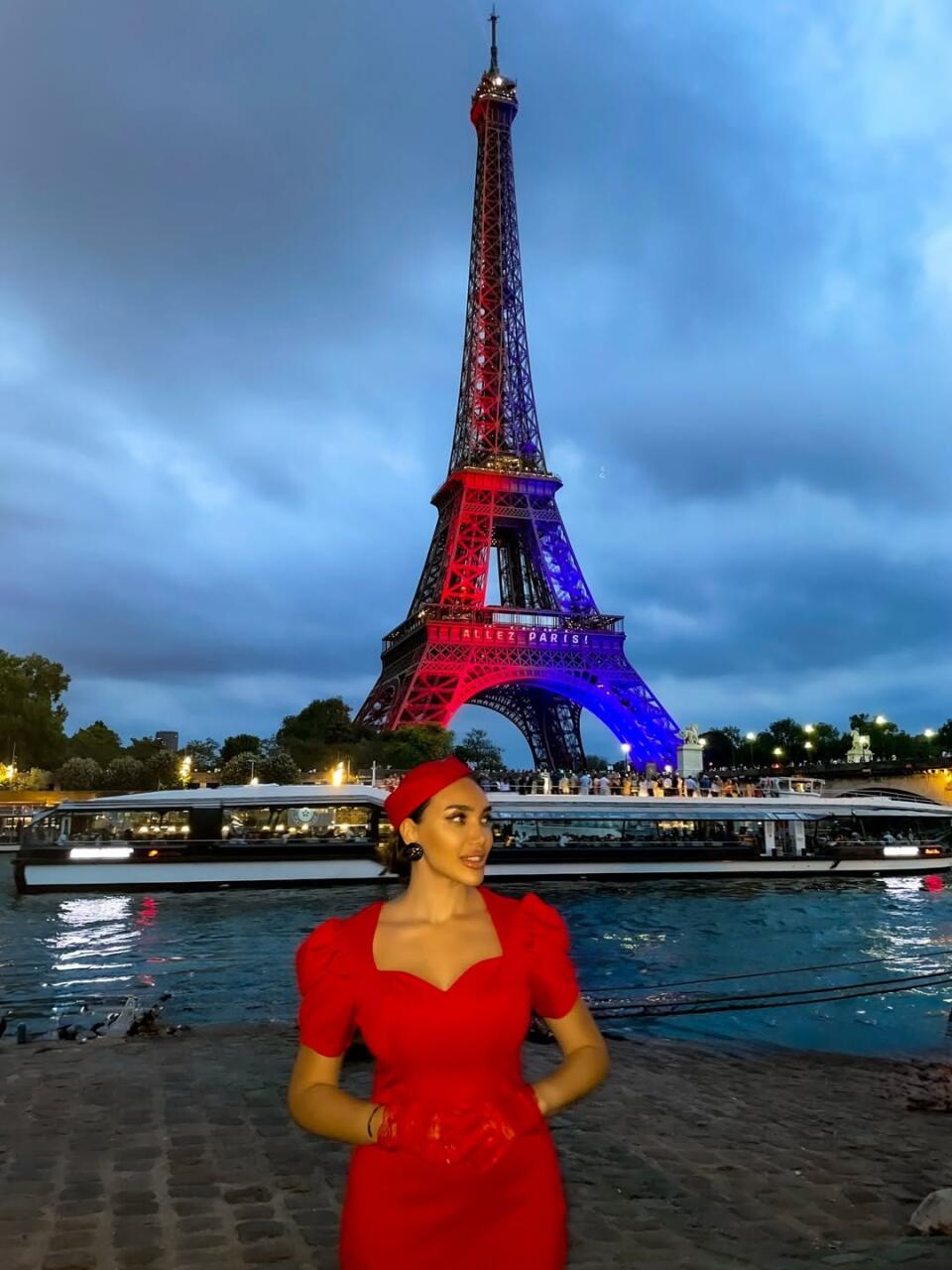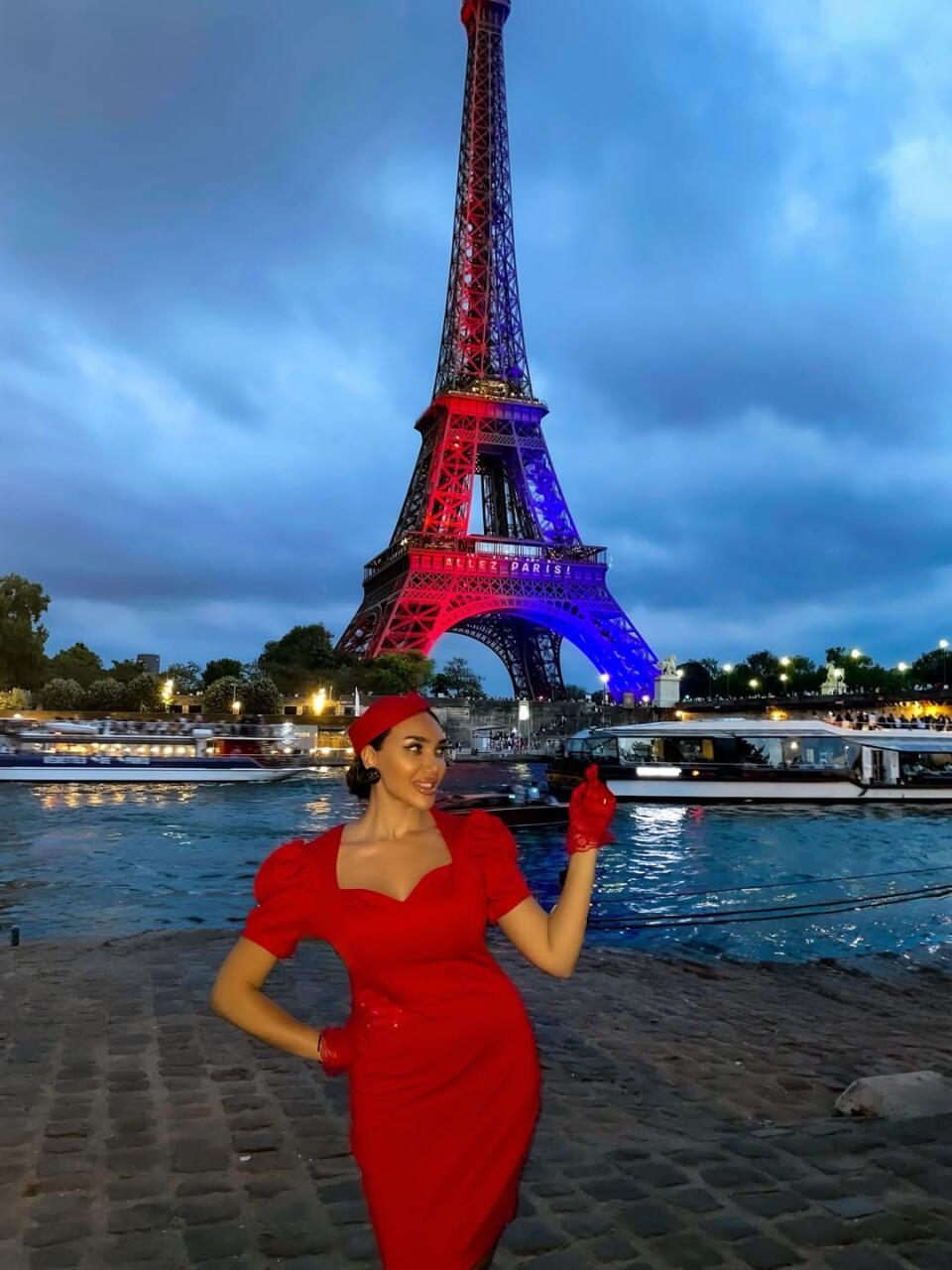 Как передает Day.Az, она опубликовала в Instagram серию фотографий, запечатлев себя на фоне Эйфелевой башни в вечернее время. На снимках башня подсвечена в цветах французского флага, что создает выразительный и символичный фон.