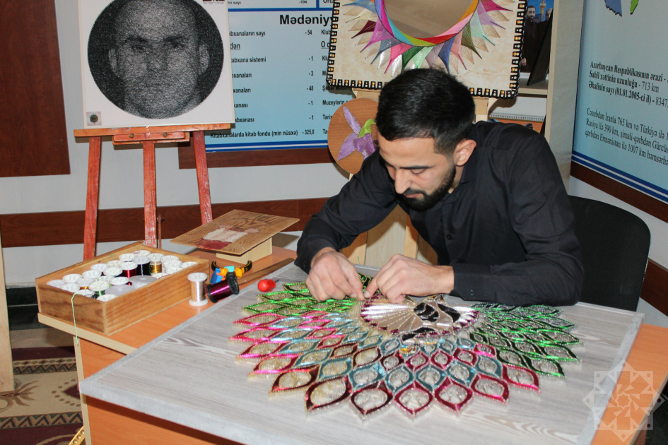 Даянат Оруджев работает продавцом в магазине. Этим редким видом искусства в Шабране кроме него никто не занимается. Для талантливого молодого человека филиграфия - это хобби. Кстати, филиграфия - это техника создания изображений и узоров с помощью нитей, натянутых между точками-опорами, чаще всего гвоздиками на деревянной основе.