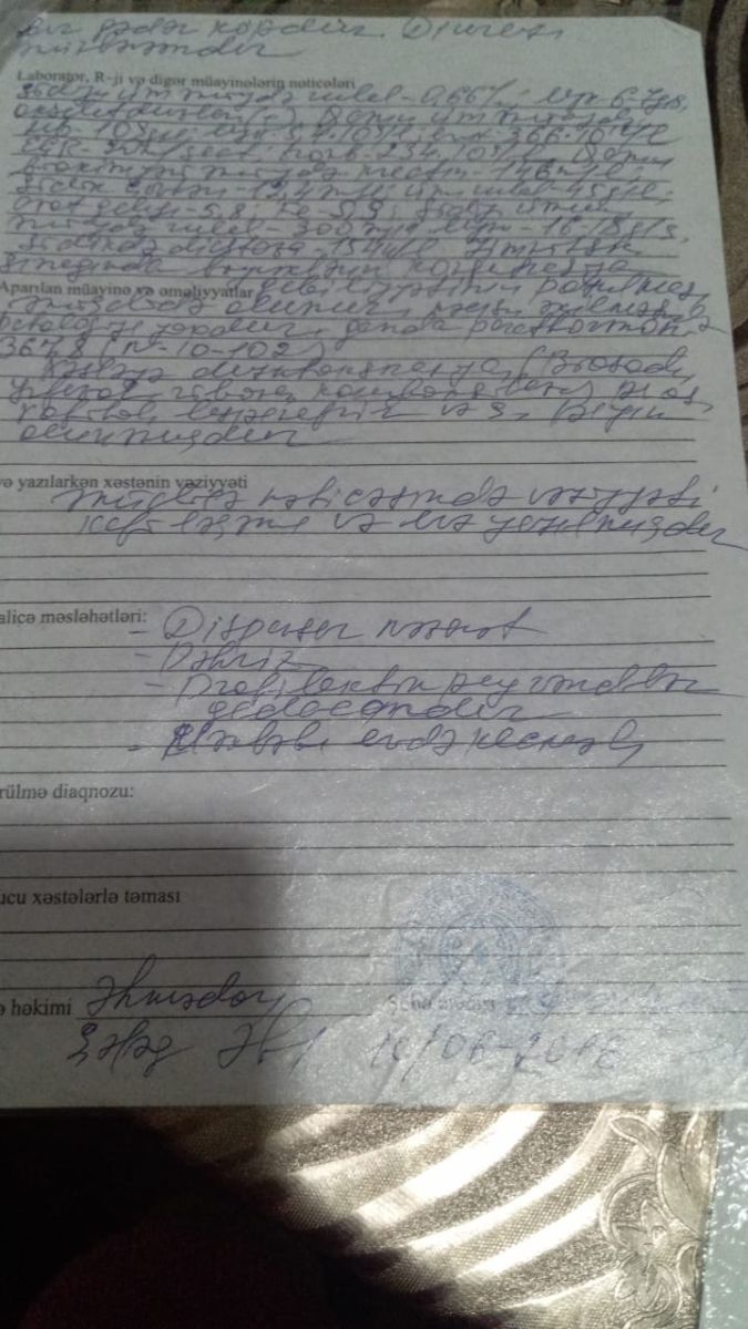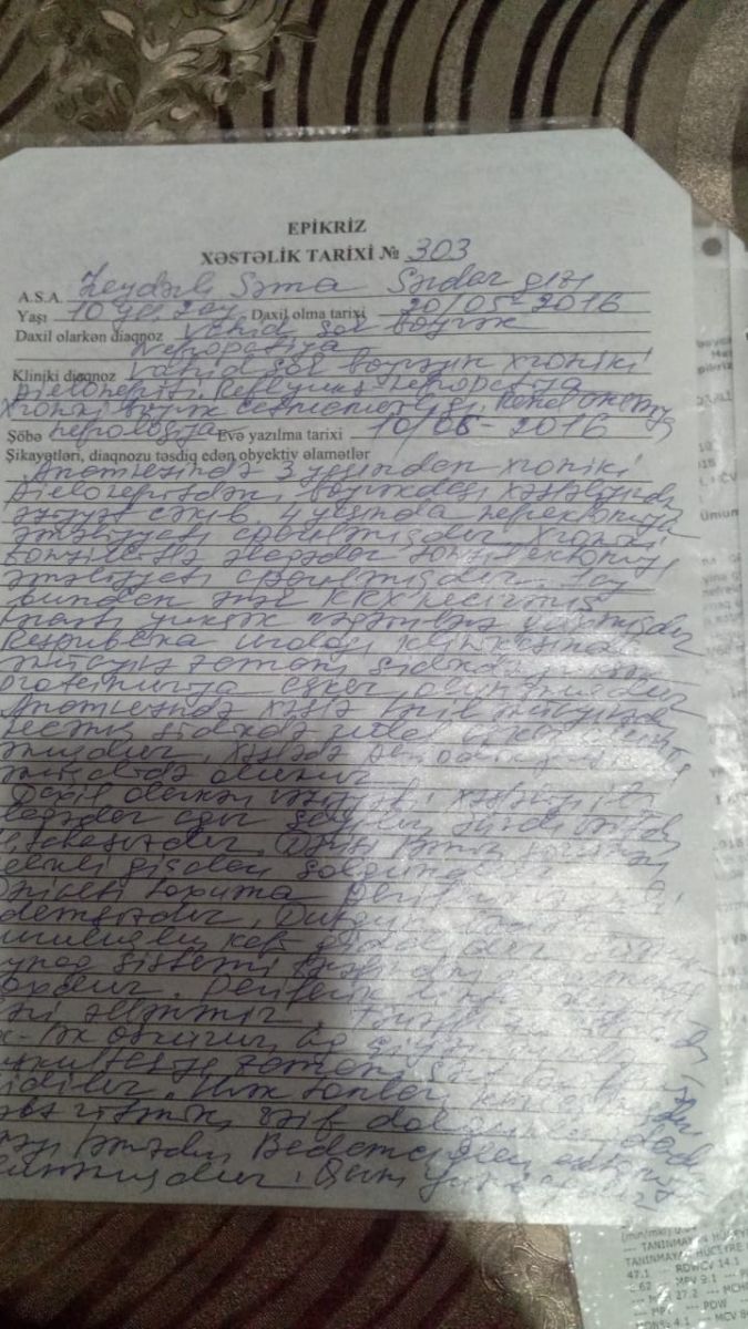 «У дочери часто бывают судороги. Врач говорит, что ей необходимо пройти обследование на всех аппаратах, но у меня нет возможности, я истощена. Я сама больна, у меня осталась только одна почка, но бросить работу не могу - я должна заботиться о дочери. Нам нужна помощь по меньшей мере в 2000 манатов, чтобы пройти обследование на всех аппаратах.», - сквозь слёзы рассказала она.