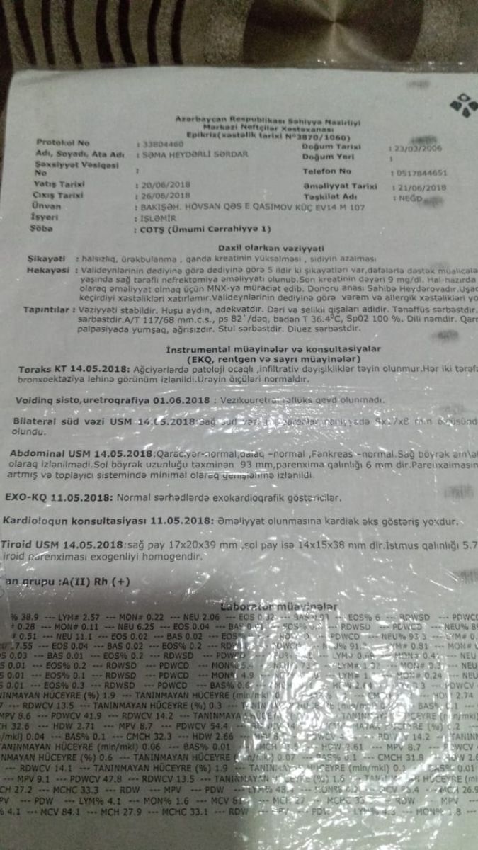 В 3 года ей удалили одну почку, а через некоторое время перестала работать и вторая. Благодаря лечению нам удалось продержаться до 12 лет. Тогда врач сказал, что дальше так продолжать нельзя: срочно нужен донор для пересадки почки. Я сама стала донором и отдала свою почку дочери. Но после операции выяснилось, что почка работает плохо. Теперь Сяма ходит на диализ через день, и врач говорит, что ей необходимо интенсивное лечение», - рассказывает Сахиба ханум.