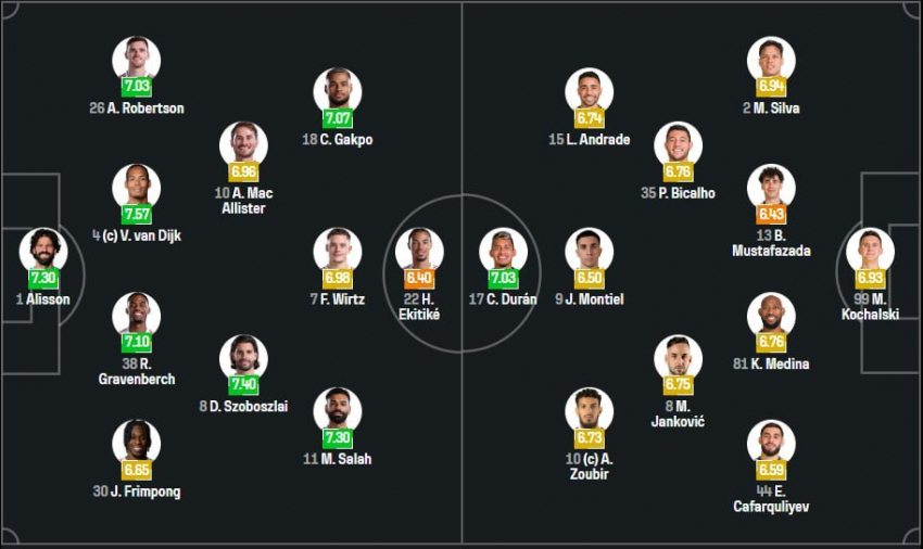 «Ливерпуль»: Алиссон, Вирджил ван Дейк (к), Райан Гравенберх, Джереми Фрипонг, Энди Робертсон, Алексис Макаллистер, Доминик Собослаи, Флориан Вирц, Коди Гакпо, Мохаммед Салах, Юго Экитике.