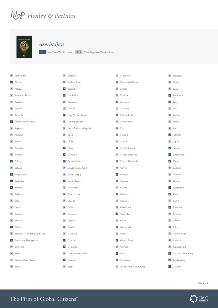 В обновленном рейтинге Азербайджан занимает 72 строчку. Число стран, которые граждане Азербайджана могут посещать без виз или с упрощенным въездом, составляет 71 - со списком этих стран можно ознакомиться ниже; страны, для посещения которых гражданам Азербайджана не требуются визы, отмечены в нижеприведенном списке галочкой.