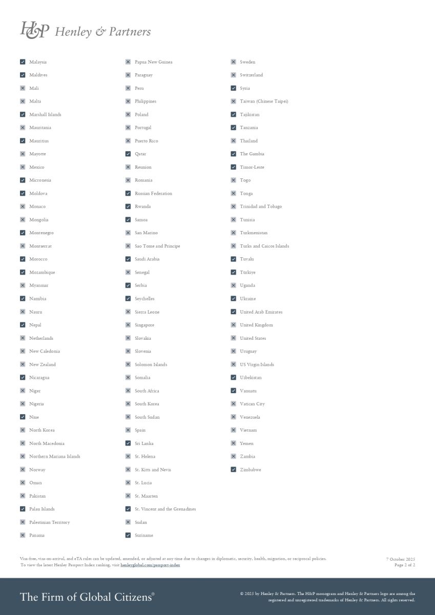 Согласно обновленному по состоянию на октябрь 2025 года Индексу паспортов мира от компании Henley & Partners, Сингапур в очередной раз возглавил список самых мощных паспортов, обеспечивая безвизовый доступ в 193 из 227 направлений.