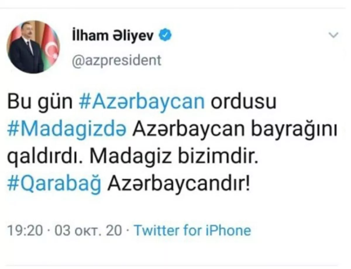 «Сегодня Азербайджанская армия подняла флаг Азербайджана в Мадагизе. Мадагиз наш. Карабах – это Азербайджан!» - об этом президент, Верховный главнокомандующий Ильхам Алиев написал в своем официальном аккаунте в Twitter.