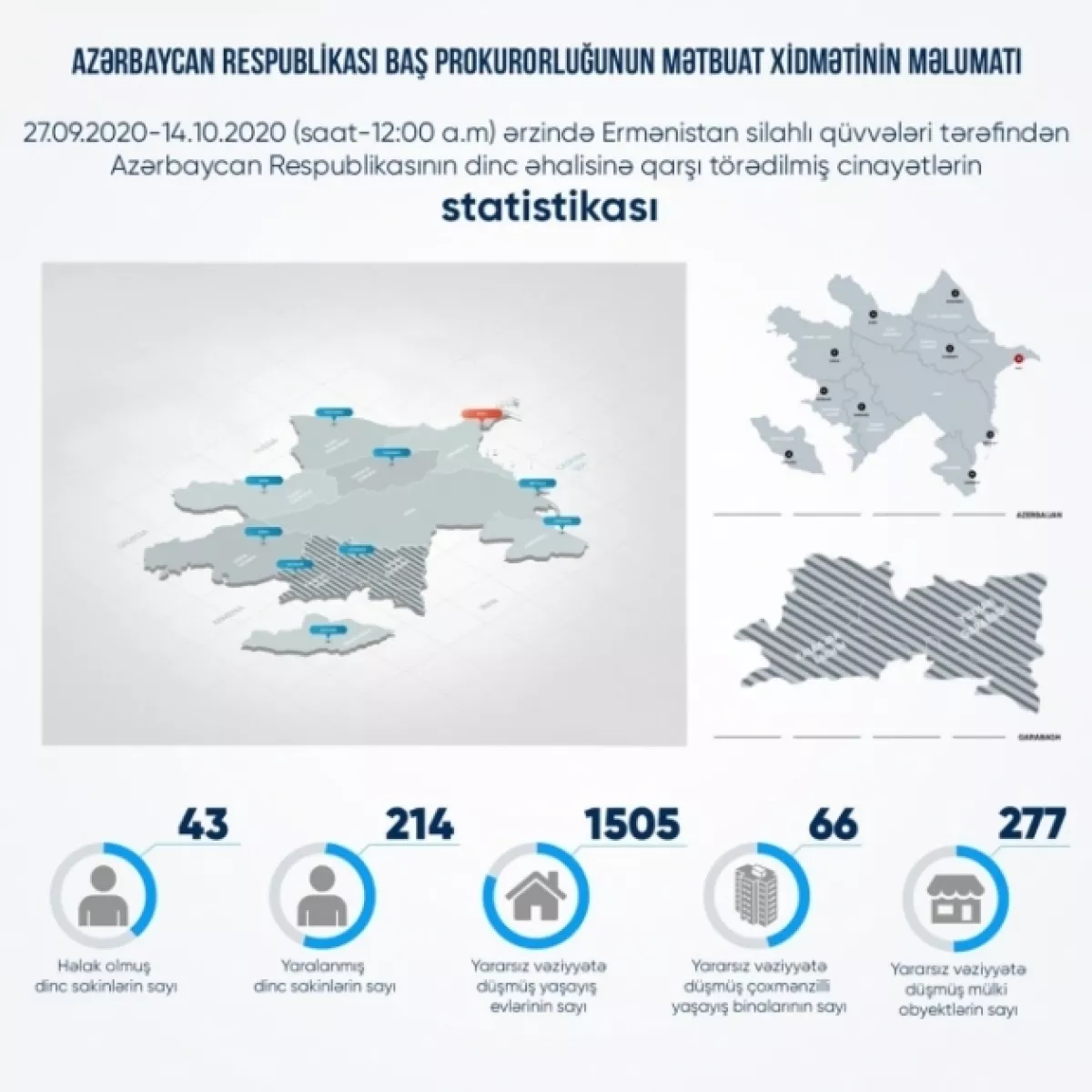 - Число погибших среди гражданского населения в результате обстрела вооруженными силами Армении населенных пунктов Азербайджана из тяжелых артиллерийских установок и ракетных систем с 27 сентября по состоянию на 12:00 часов 14 октября достигло 43, а пострадавших – 214, нанесен ущерб 1505 домам, 66 многоквартирным зданиям и 277 гражданским объектам. Об этом сообщила Генеральная прокуратура.