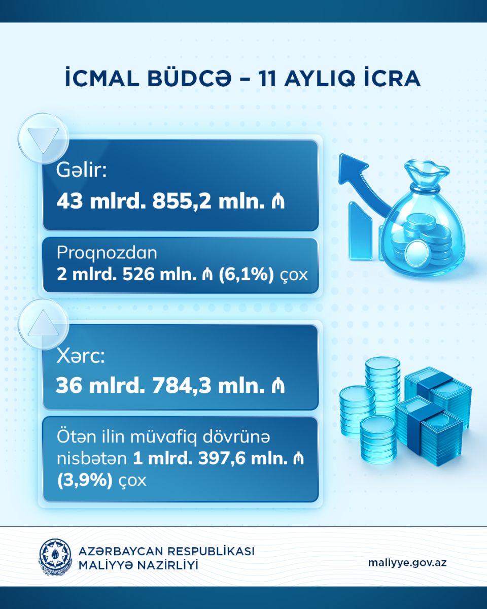 За январь-ноябрь текущего года доходы сводного бюджета составили 43 млрд 855,2 млн манатов, что превысило 11-месячный прогноз на 2 млрд 526 млн манатов, или на 6,1%.