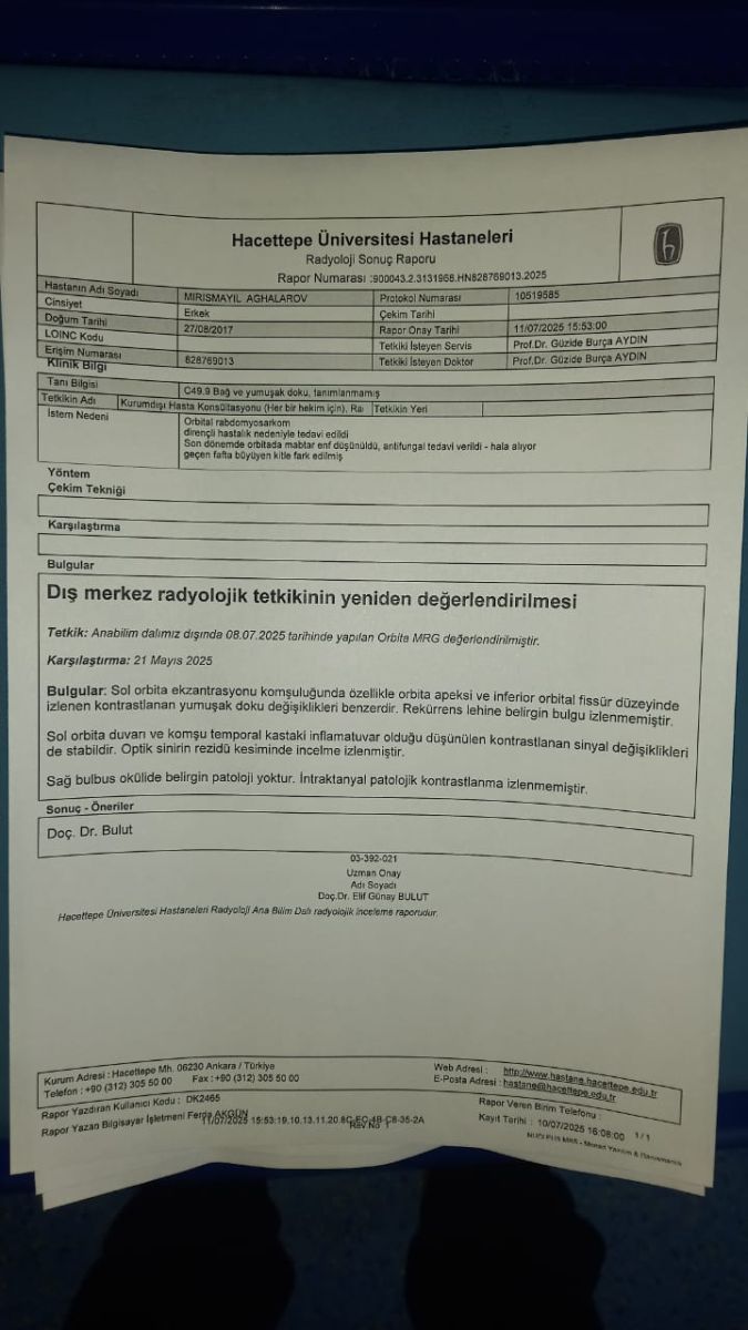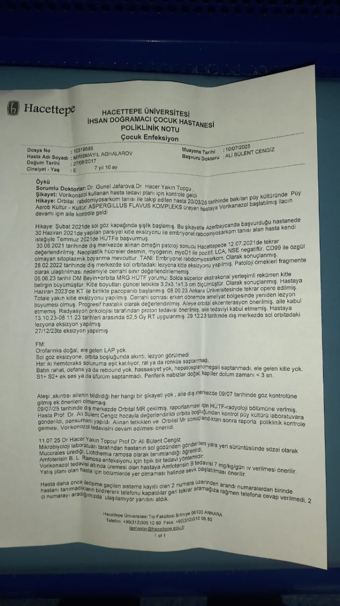 «Более шести лет он проходил лечение в клинике «Хаджеттепе» в Анкаре, Турция. Бесчисленные сеансы химиотерапии и операции оказались безуспешными. Левый глаз Мирисмаила был ампутирован», - с горечью рассказал отец.
