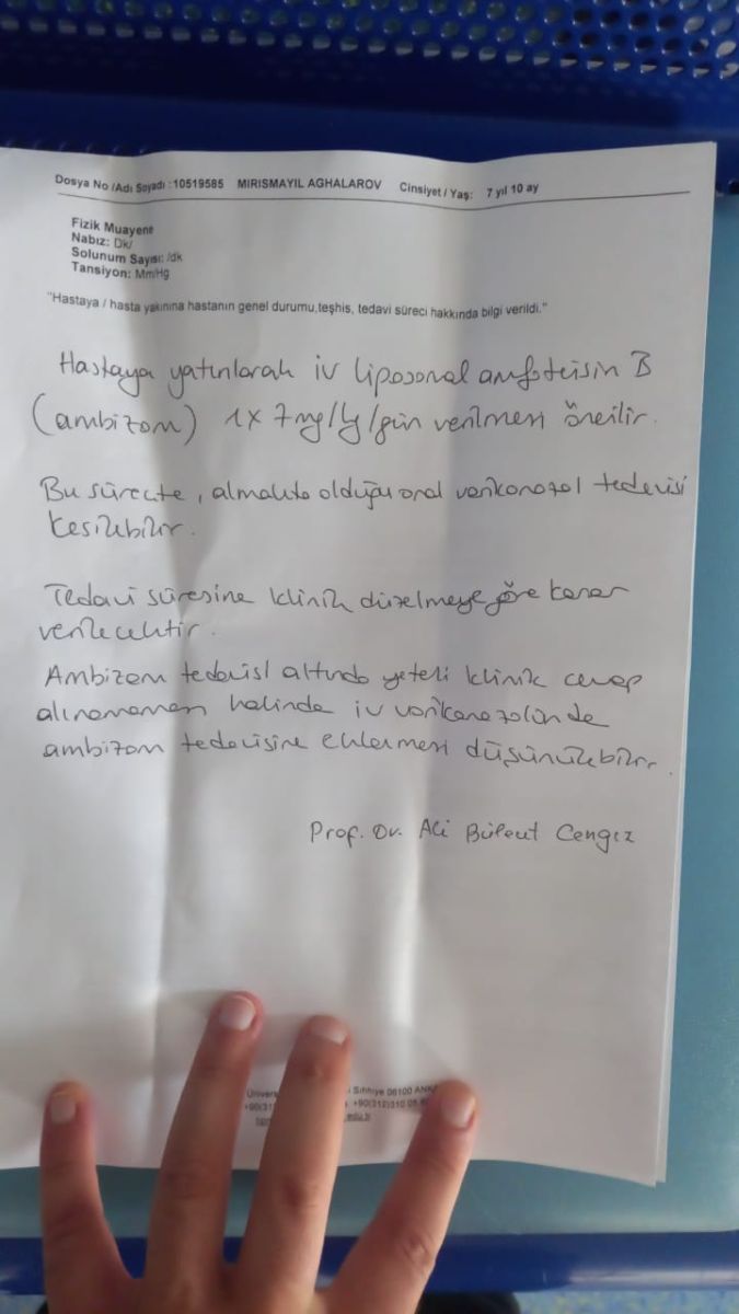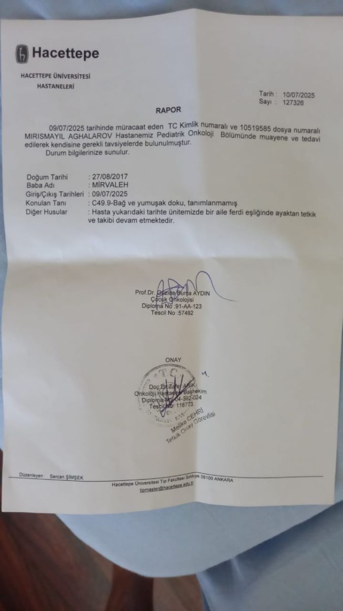 В настоящее время лечение проходит в больнице Енишехир в Анкаре. Моя жена ночует с Мирисмаилом на стульях в коридоре больницы. Я прошу состоятельных и неравнодушных людей поддержать моего ребенка».