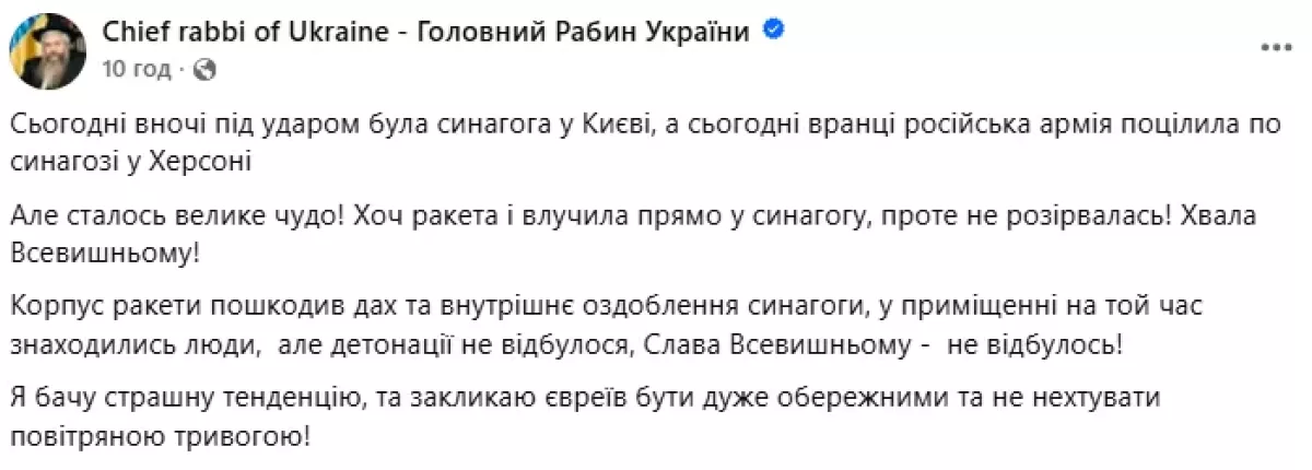 «Корпус ракеты повредил крышу и внутреннее убранство синагоги, в помещении в то время находились люди, но детонации не произошло, слава Всевышнему, не произошло!» – написал главный раввин Украины.