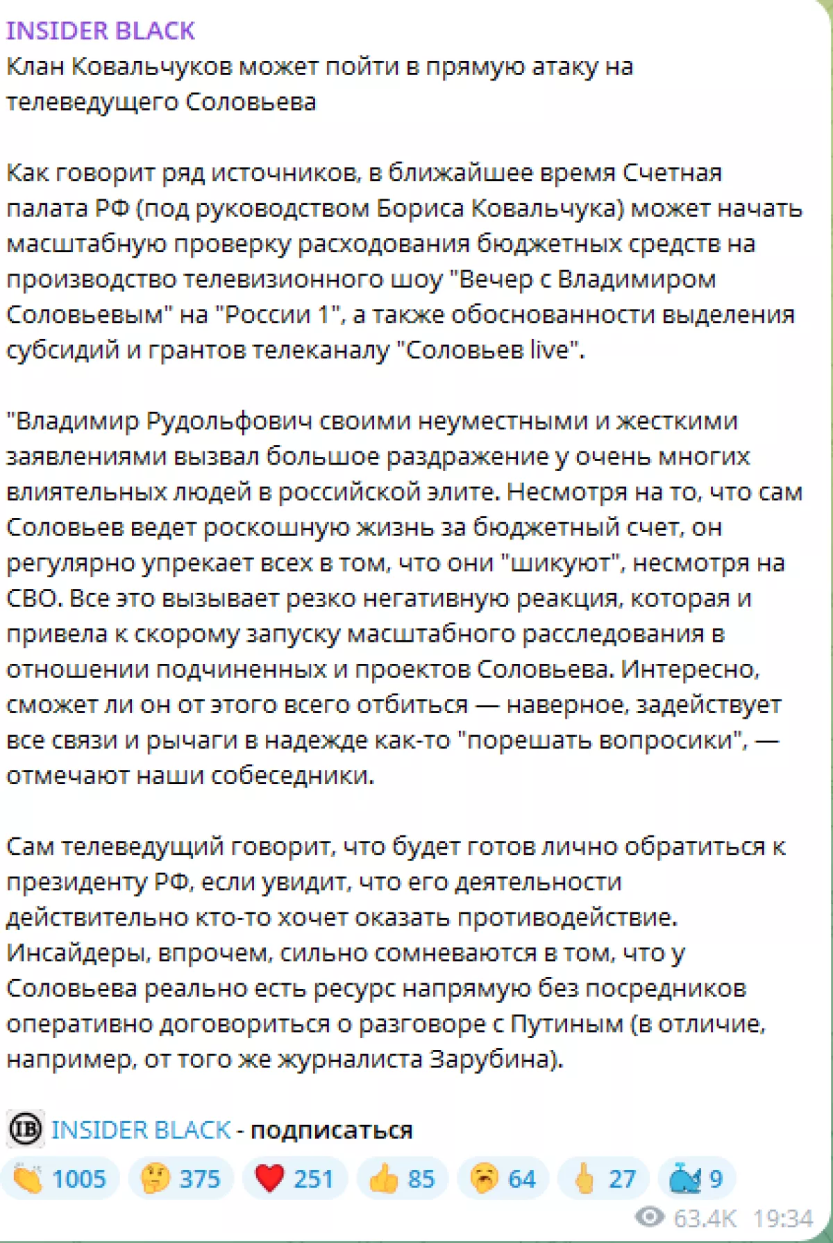 «Владимир Рудольфович своими неуместными и жесткими заявлениями вызвал большое раздражение у очень многих влиятельных людей в российской элите. Несмотря на то, что сам Соловьев ведет роскошную жизнь за бюджетный счет, он регулярно упрекает всех в том, что они «шикуют», несмотря на СВО. Все это вызывает резко негативную реакцию, которая и привела к скорому запуску масштабного расследования в отношении подчиненных и проектов Соловьева. Интересно, сможет ли он от этого всего отбиться — наверное, задействует все связи и рычаги в надежде как-то «порешать вопросики», — отмечают собеседники INSIDER BLACK.
