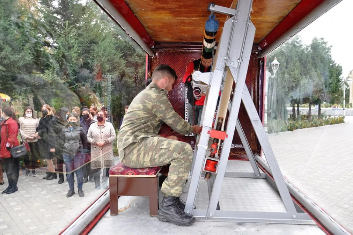 Станок ковра, который будет представлен посетителям музея в Шуше в качестве экспоната, перевозился в различные регионы нашей страны на специальном автомобиле в течение 44 дней и был соткан петля за петлей с участием тысяч людей. Первые петли были сделаны участниками войны, а последние были завязаны в Шуше спустя 44 дня. Раскрой ковра, на котором изображен Харыбюльбюль - символ нашей Победы, прошел с участием семей шехидов.