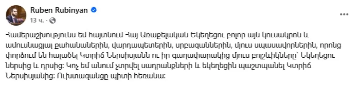 «Выражаю свою солидарность всем тем монашествующим и женатым иереям, вардапетам, србазанам, другим служителям Армянской Апостольской Церкви, которых пытаются подвергать гонениям Ктрич Нерсисян и его единомышленники — другие большевики, как изнутри церкви, так и снаружи. Призываю не поддаваться на провокации и защищать церковь от Ктрича Нерсисяна. Клятвопреступник (нарушивший обет) должен уйти», — написал он.