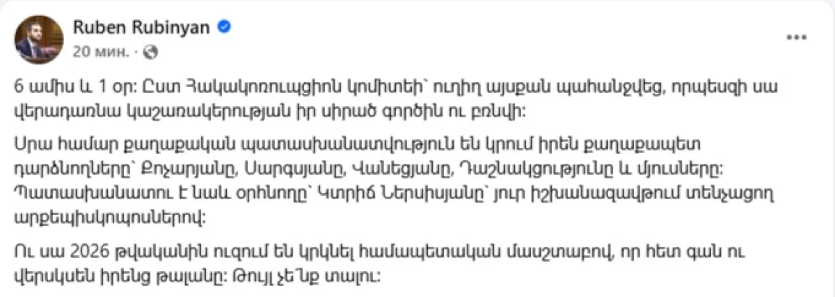 Как передает Caliber.Az, соответствующий пост Рубинян опубликовал на своей странице в Facebook.