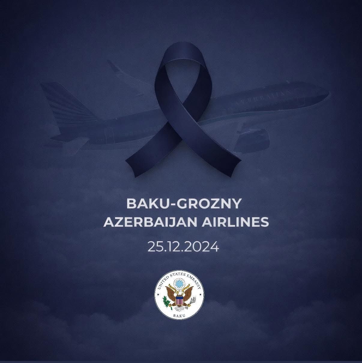 «Сегодня мы чтим память тех, кто погиб в катастрофе рейса №8243 авиакомпании Azerbaijan Airlines, и отмечаем мужество капитана Игоря Кшнякина, первого офицера Александра Калянинова и бортпроводницы Хокумы Алиевой, чьи действия помогли предотвратить гибель еще большего числа ни в чем не повинных людей. От имени Соединенных Штатов мы выражаем наши глубочайшие соболезнования семьям и друзьям 38 человек, погибших в этой трагедии, а также наши искренние пожелания скорейшего восстановления всем, кто выжил», - говорится в заявлении посольства США в Баку.
