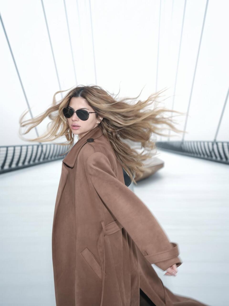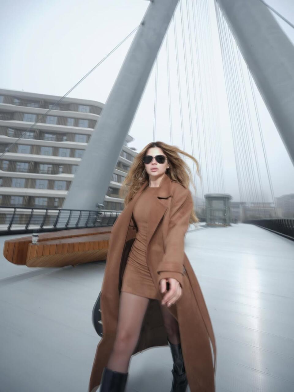 Певица выбрала монохромный лук в оттенках карамели и шоколада: приталенное мини-платье, длинное пальто свободного кроя, чёрные очки и высокие сапоги. Развевающиеся волосы и движение в кадре добавляют образу кинематографичности и ощущения свободы.