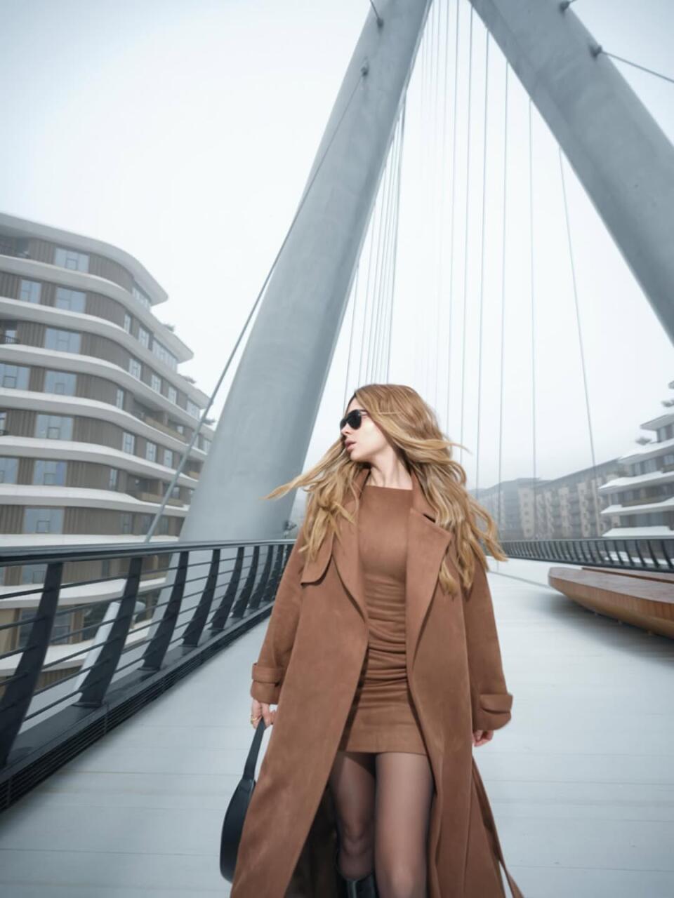 Как передает Day.Az, на снимках - урбанистический пейзаж с пешеходным мостом, выразительными линиями и холодной архитектурной геометрией, которая контрастирует с тёплой цветовой гаммой образа.