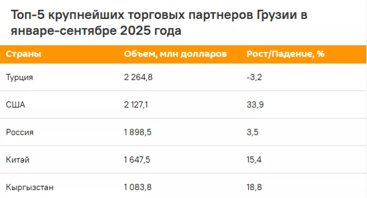 В десятку торговых партнеров Грузии также входят: Азербайджан, Германия, Казахстан, Армения и Великобритания.