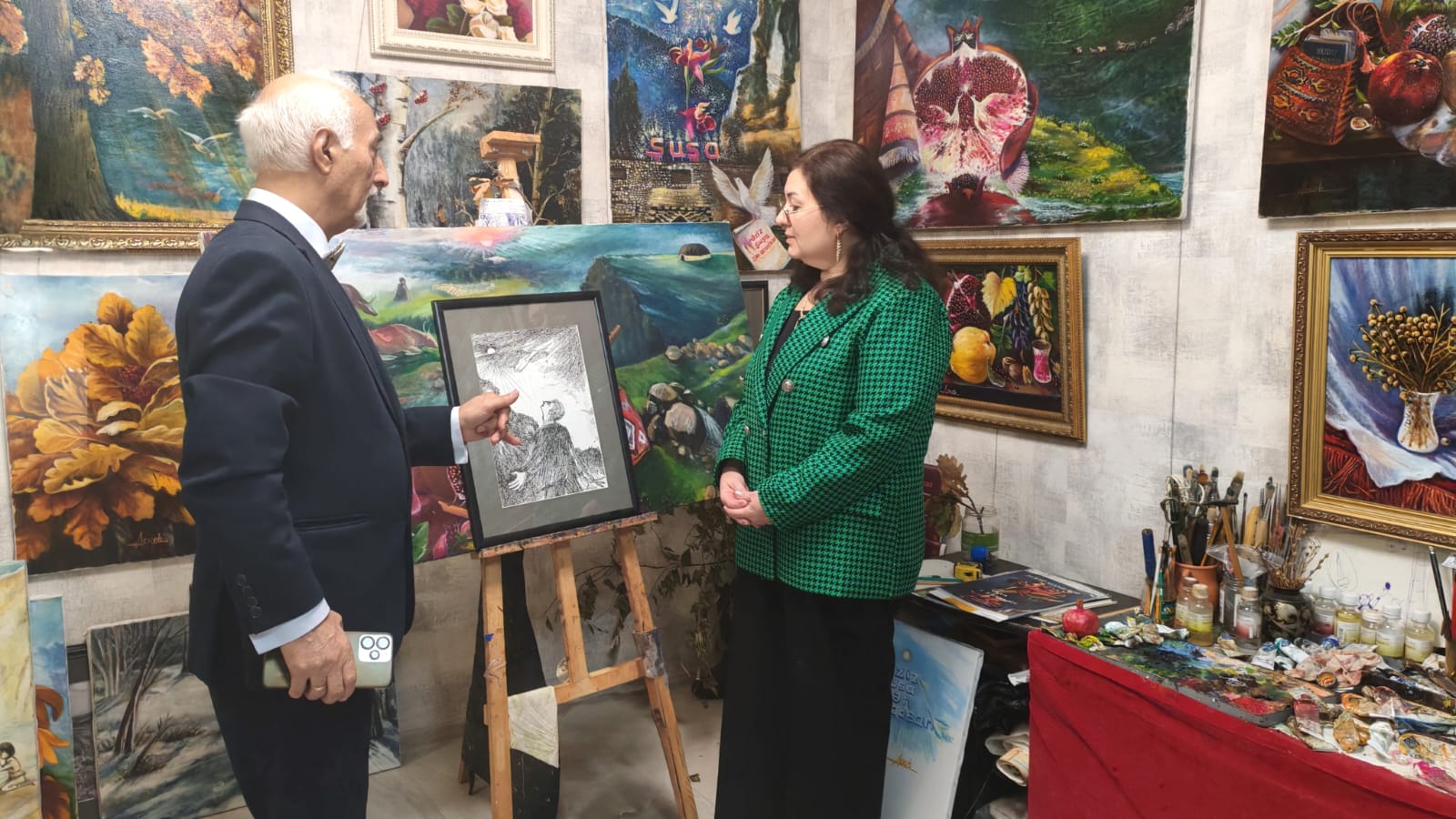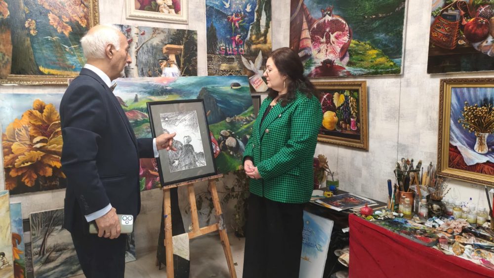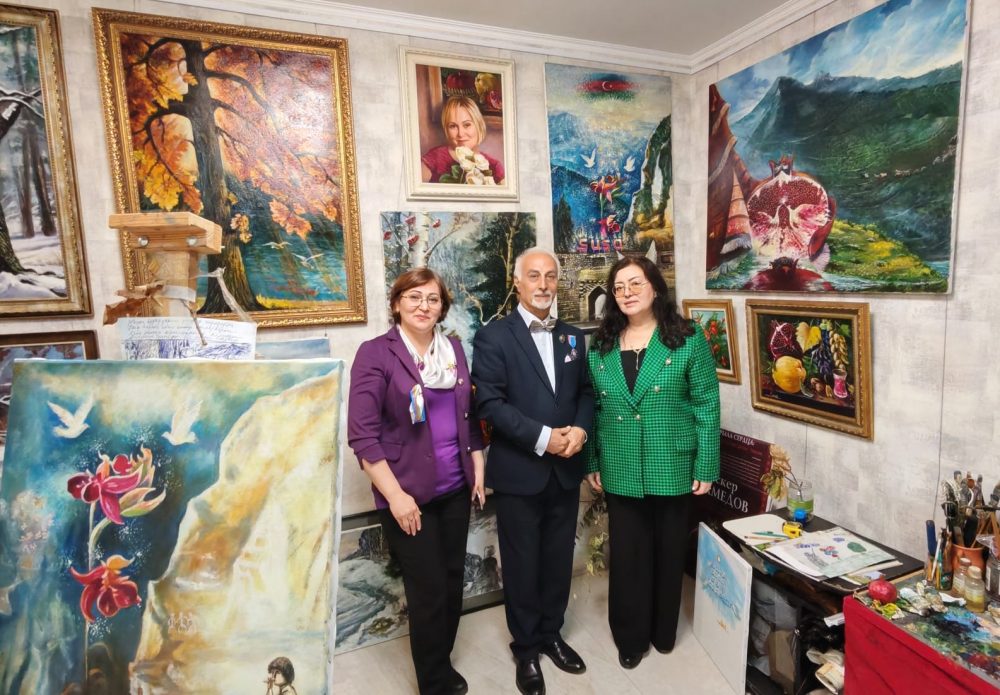 Недавно мастерскую художника в Москве посетили азербайджанские женщины во главе с Лейлой Фараджевой. Этот визит стал не просто знакомством с творчеством выдающегося мастера, но и настоящим погружением в атмосферу азербайджанской культуры и духовности, словно глоток родниковой воды в жаркий день. В галерее Аскера Мамедова гости увидели множество работ, посвященных Азербайджану: спелые гранаты, душистая айва, пейзажи Шуши, символ Карабаха – хары-бюльбюль, словно яркие воспоминания о доме, согревающие душу.