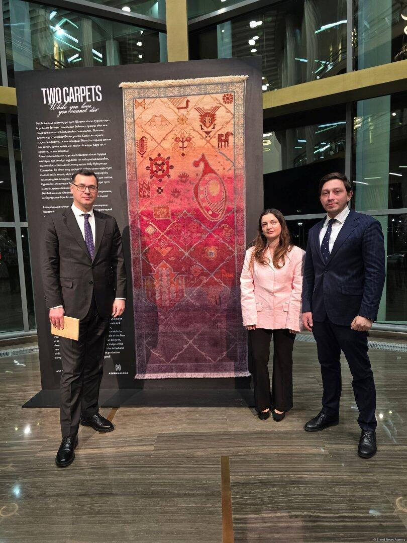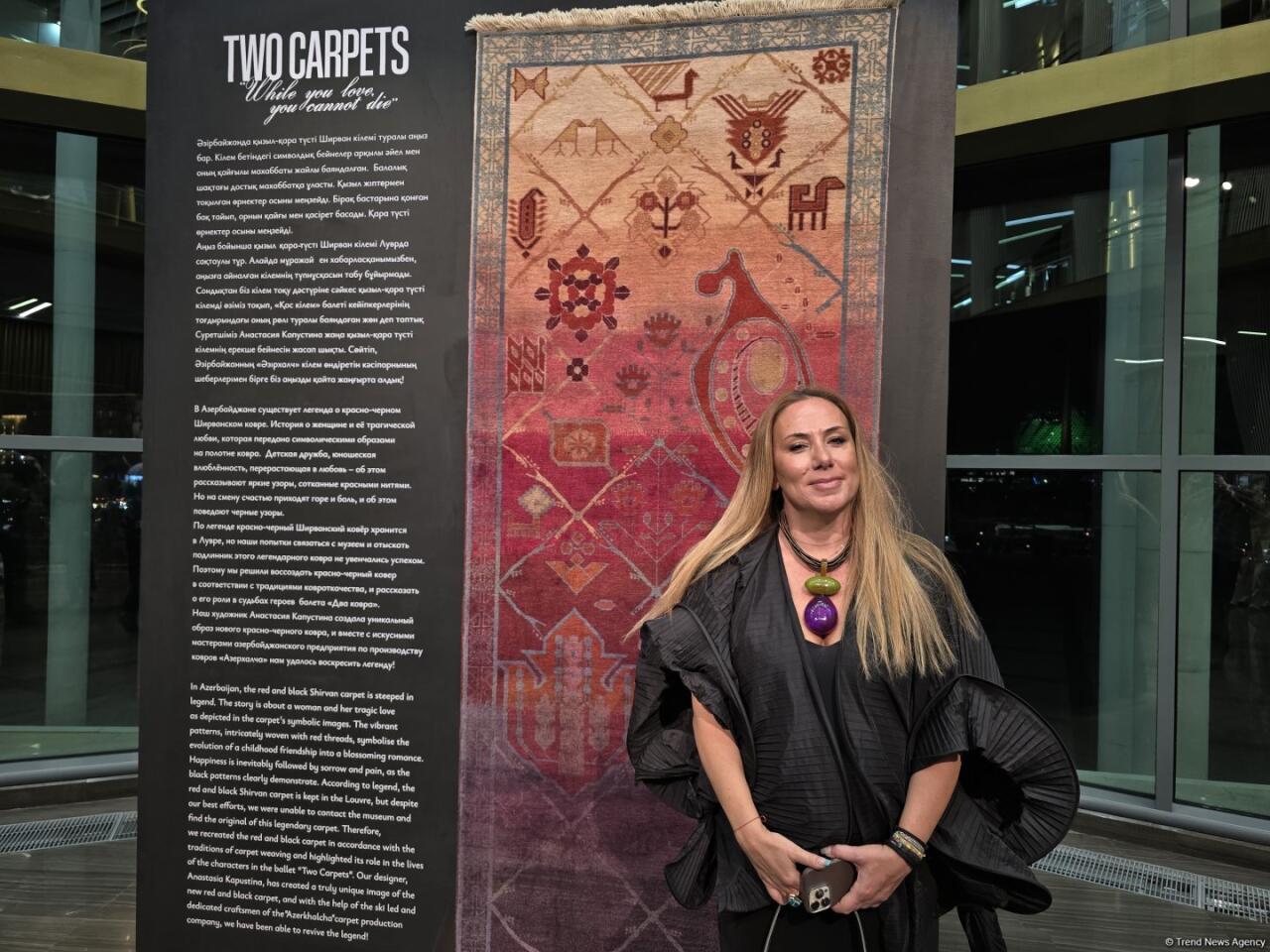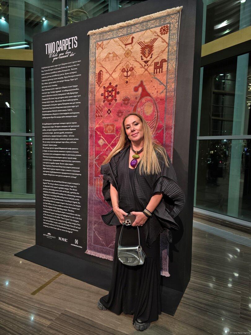 "Прекрасное соединение культур народов, театра и декоративного искусства бесспорно заслуживает самых высоких слов. Работа над проектом началась несколько месяцев назад, когда нам представили историю, посвящённую древнему азербайджанскому искусству ковроткачества. И на основе разработанного эскиза (автор - Анастасия Капустина) в короткие сроки наша большая команда смогла создать эксклюзивный ковер, в единственном экземпляре, который представлен в экспозиции, фактически став одним из участников театрального события. Здесь мы также представили редкие экземпляры из богатой коллекции "Азерхалча", чтобы казахстанская публика могла ближе познакомиться с нашими ковровым искусством. Уверена, что балет "Два ковра" с большим успехом будет представлен на мировых сценах и в Азербайджане", - отметила Асмар Бабаева.