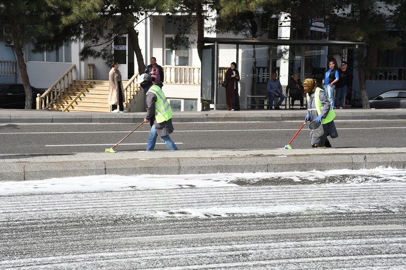 С раннего утра коммунальные службы столицы приступили к мойке центральных улиц и проспектов с использованием безопасных для растений и животных моющих средств. Были также очищены дворовые территории и внутриквартальные дороги.