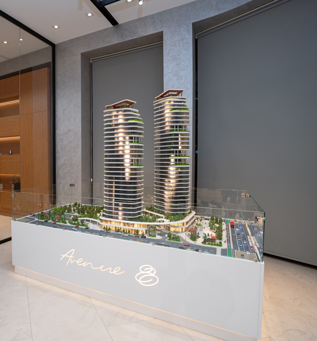 Во время открытия гостям впервые был представлен масштабный архитектурный макет комплекса, состоящего из двух башен высотой 27 и 30 этажей, объединённых стилобатом с ландшафтной террасой и развитой клубной инфраструктурой. Архитектурная концепция Avenue 8 отличается редкими для жилых проектов параметрами: панорамным остеклением, высотой потолков 4,5 метра и знаковым Infinity Sky Pool на 31-м этаже с видом на Каспий.