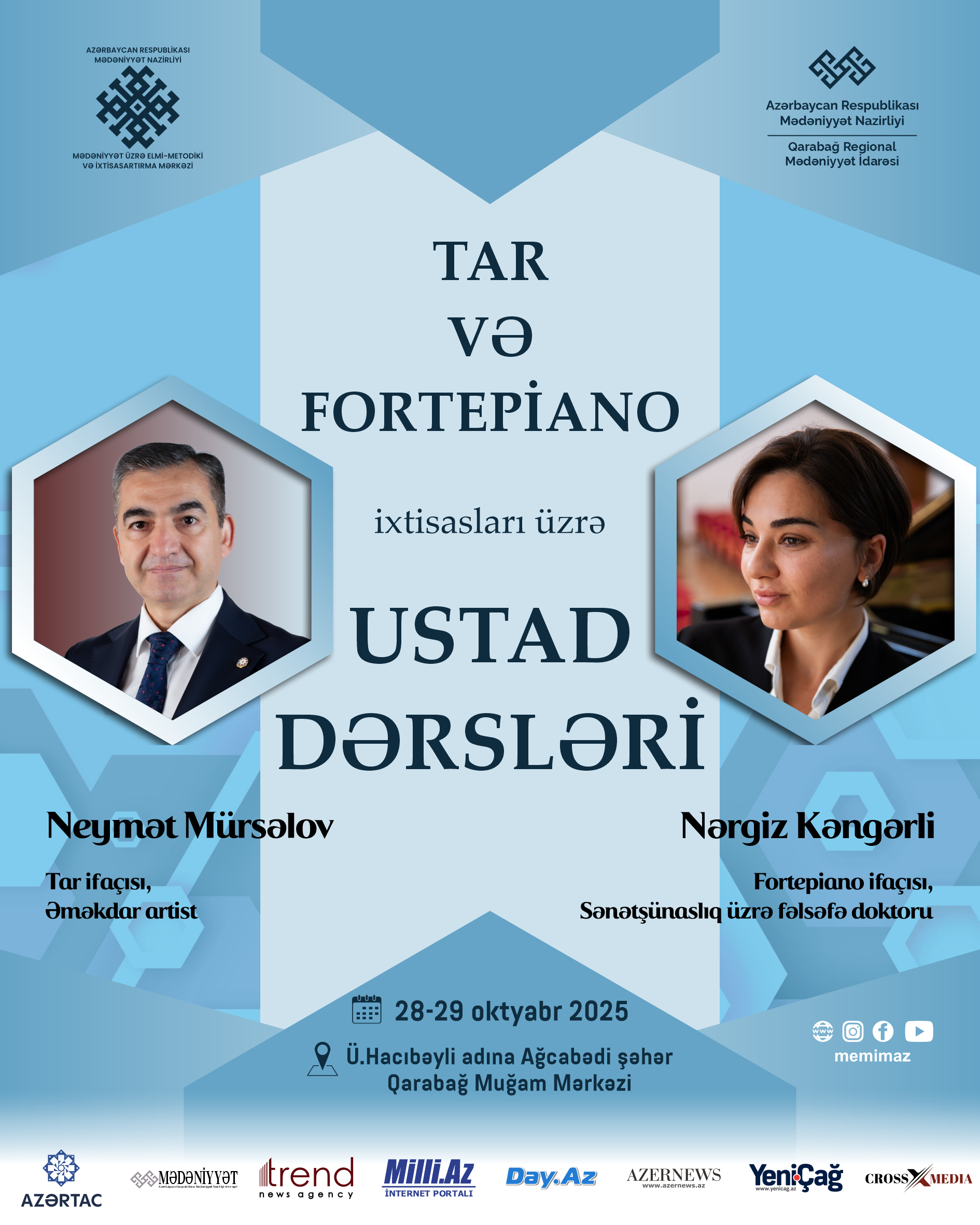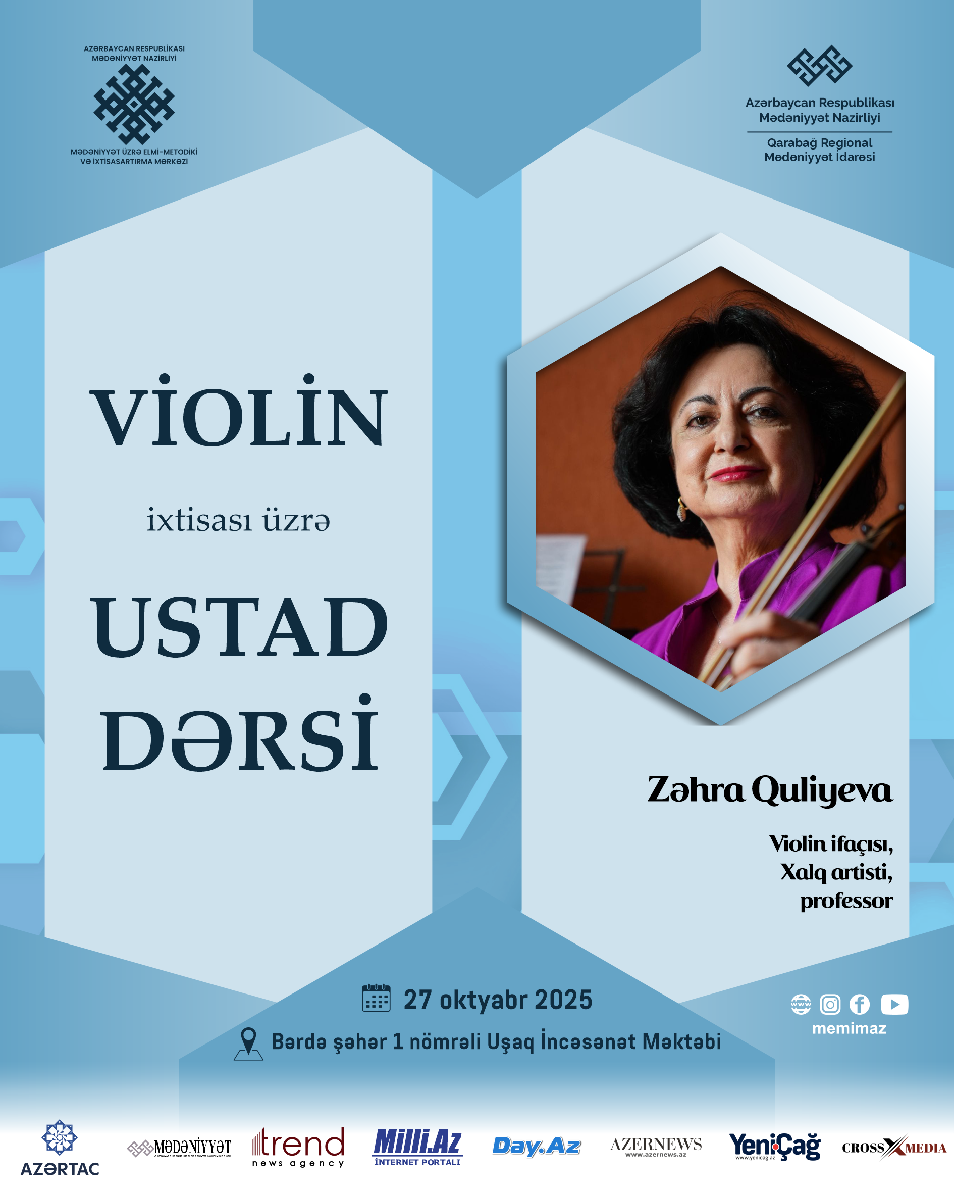 В рамках "Ветра культуры" также запланирован ряд мастер-классов. 27 октября в Детской школе искусств №1 города Барда пройдут мастер-классы по скрипке с участием народной артистки, профессора Захры Гулиевой, а также 28 октября Карабахском центре мугама имени Узеира Гаджибейли города Агджабеди - мастер-классы по тару с участием заслуженного артиста Неймата Мурсалова и по фортепиано – доктора искусствоведения Наргиз Кенгерли.