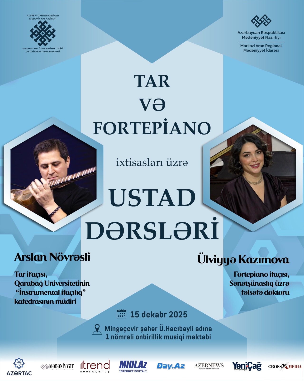 15 декабря в одиннадцатилетней музыкальной школе № 1 имени Узеира Гаджибейли в городе Мингячевир пройдут мастер-классы по тару и фортепиано. Мастер-класс по тару проведёт заведующий кафедрой инструментального исполнительства факультета искусств Карабахского университета Арслан Новрасли, а мастер-класс по фортепиано - доктор философии по искусствоведению, председатель предметной профсоюзной комиссии фортепианного отделения Музыкального колледжа при Азербайджанской национальной консерватории (АМК) Ульвия Кязымова.