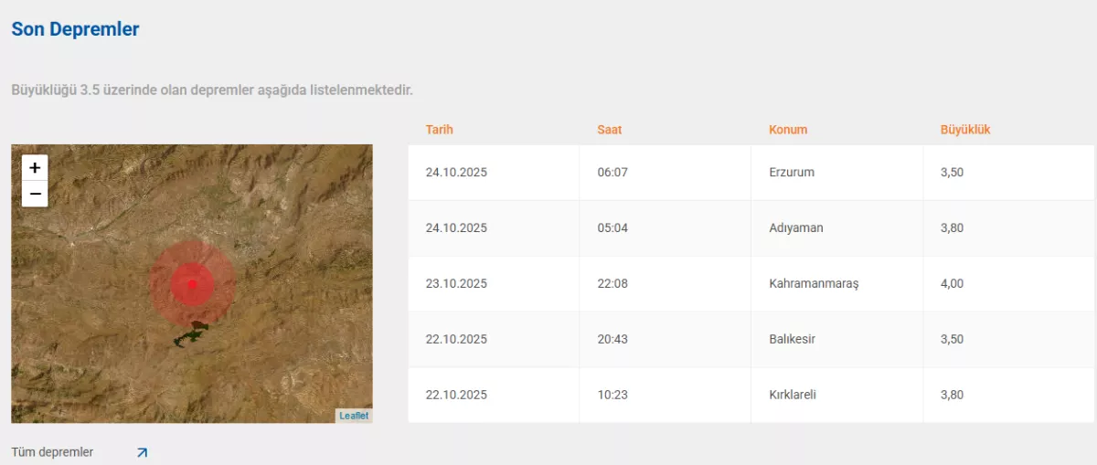 Как передает Caliber.Az, согласно заявлению Управления по чрезвычайным ситуациям и ликвидации последствий стихийных бедствий Турции (AFAD) в районе Синджик (Адыяман) зафиксировано землетрясение магнитудой 3,8 балла, а в районе Паландёкен (Эрзурум) — толчки силой 3,5 балла.