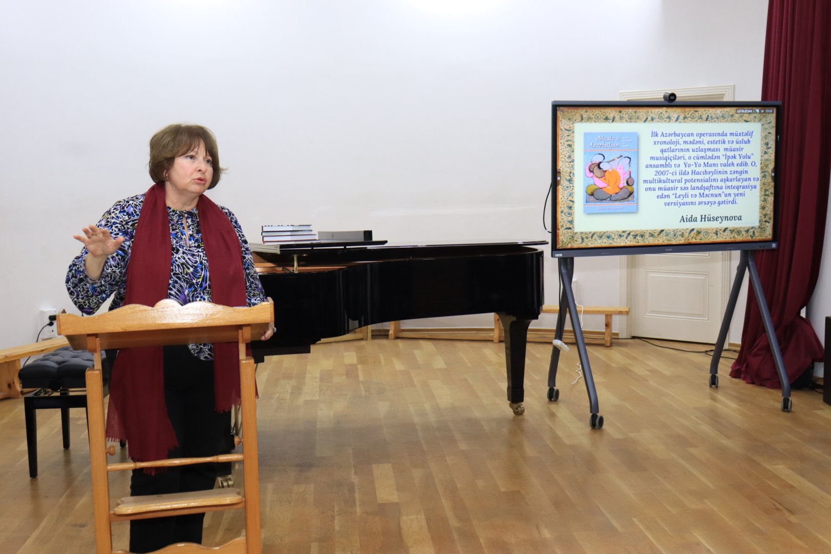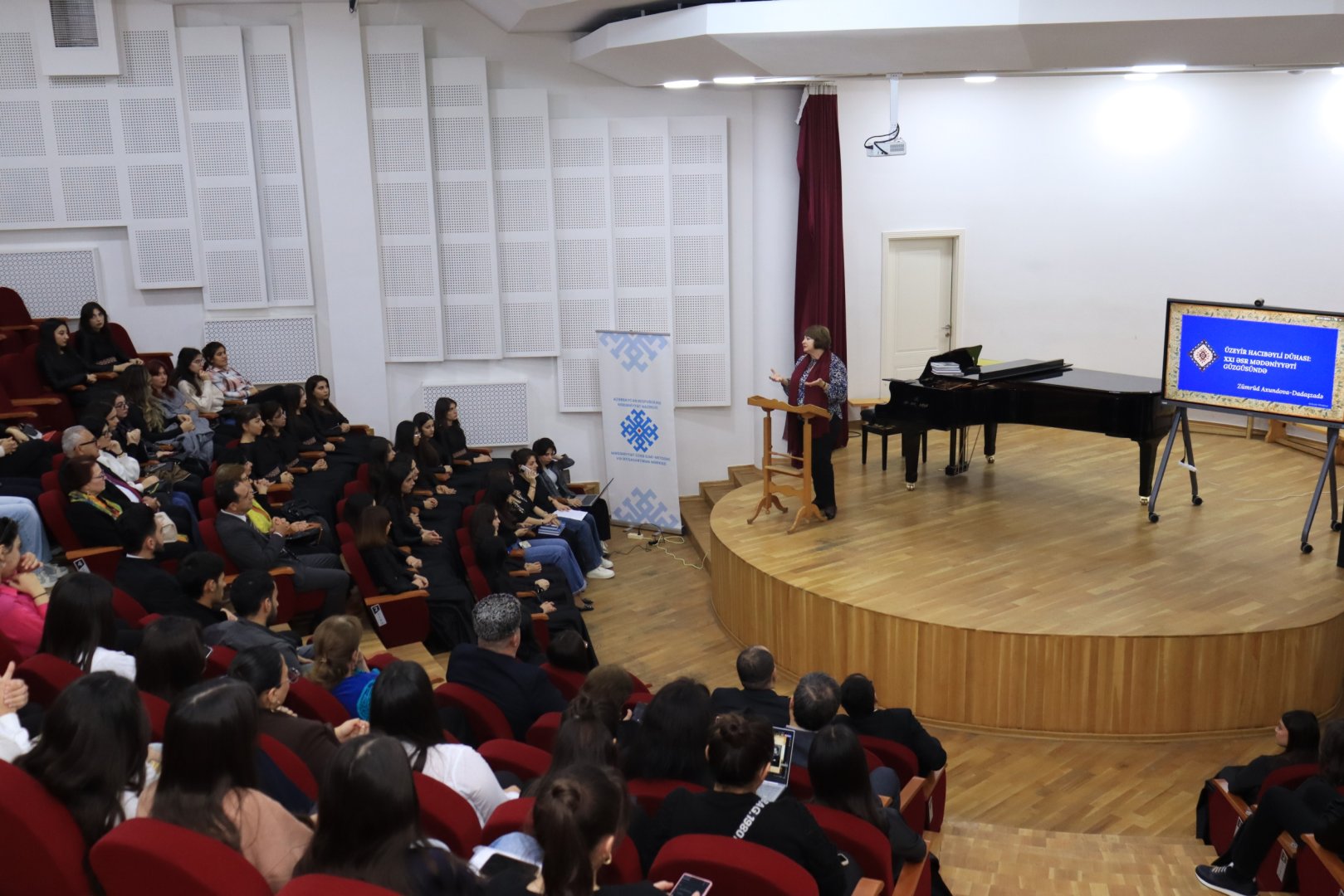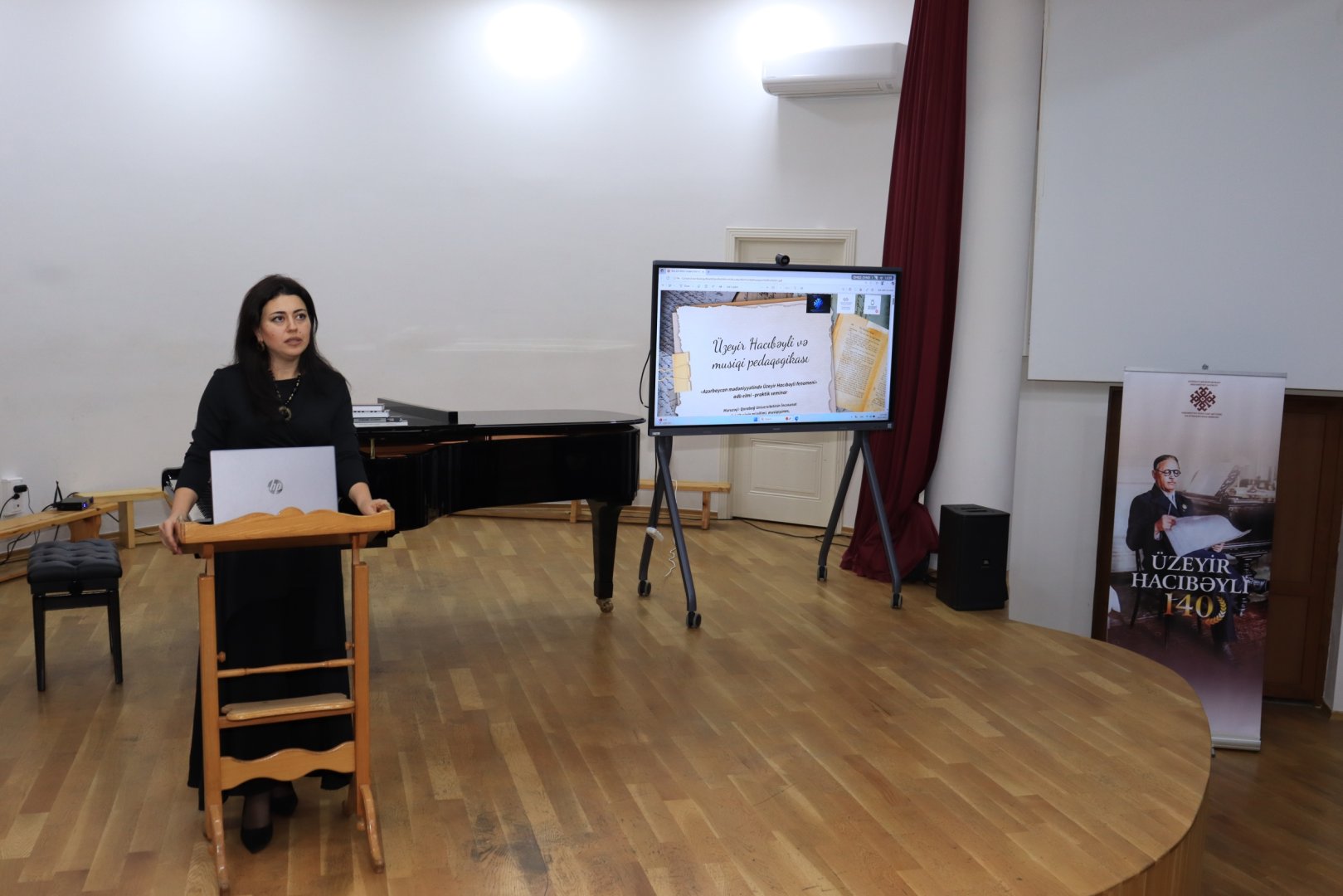 Доктор философии по искусствоведению, старший преподаватель факультета искусств Карабахского университета Айбениз Новрасли выступила с докладом на тему "Узеир Гаджибейли и музыкальная педагогика", в котором рассказала о различных системах, существующих в сфере музыкального образования. Выступающие ответили на вопросы аудитории, а также в дар Карабахскому университету был передан ряд научных публикаций.