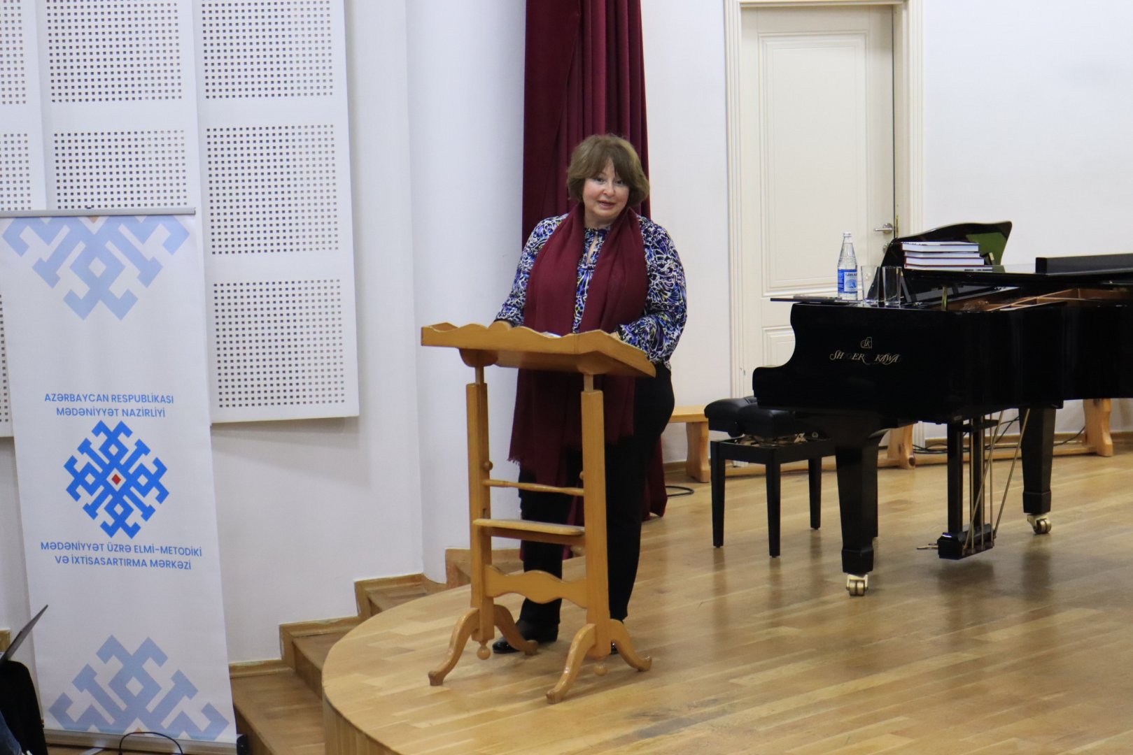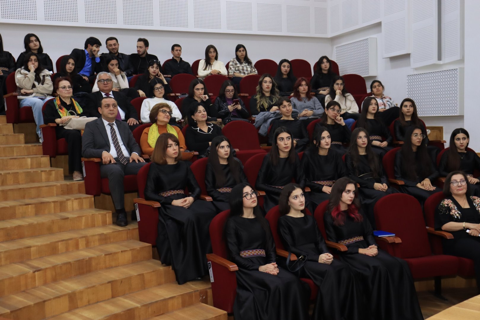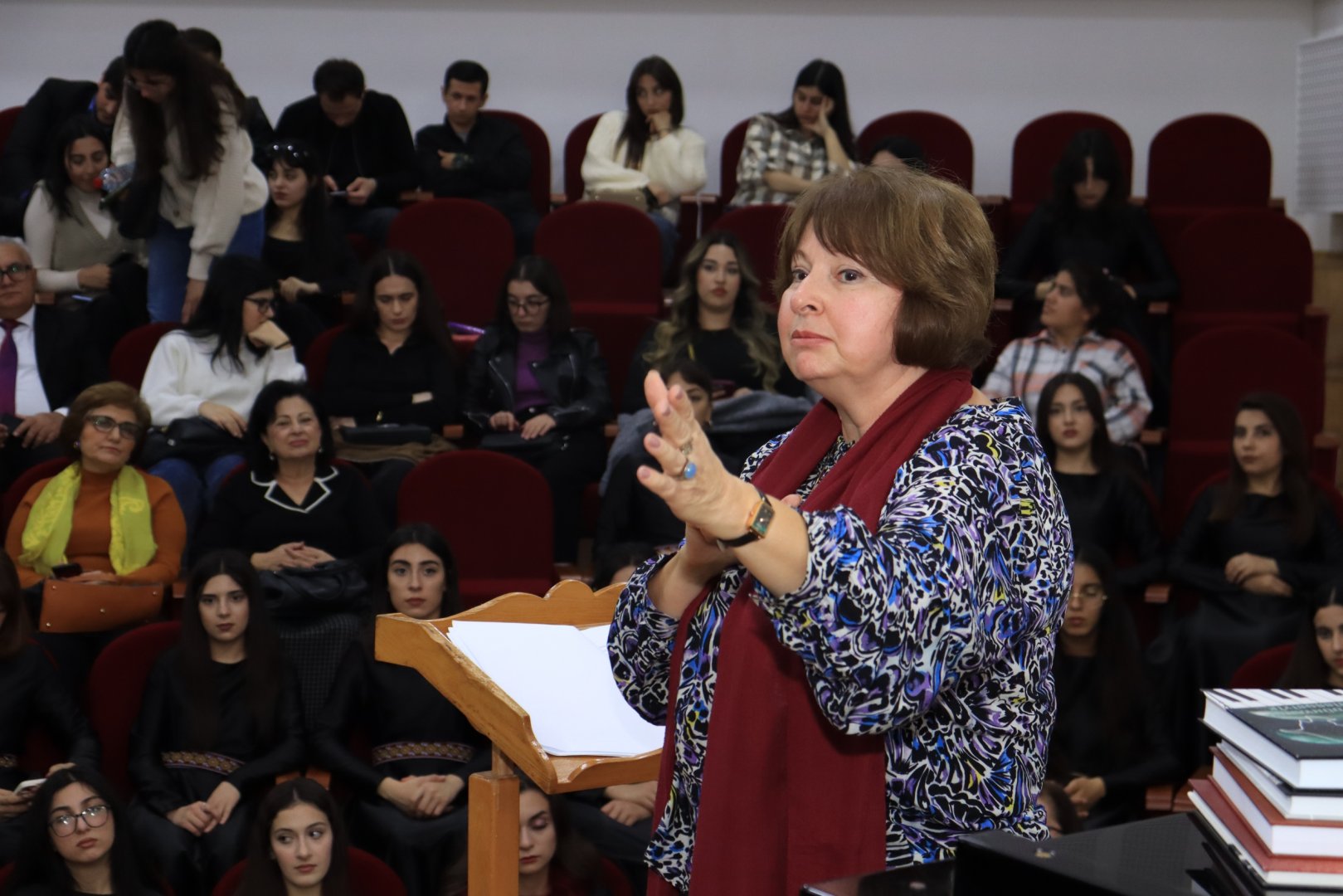Доктор философии по искусствоведению, старший преподаватель факультета искусств Карабахского университета Айбениз Новрасли выступила с докладом на тему "Узеир Гаджибейли и музыкальная педагогика", в котором рассказала о различных системах, существующих в сфере музыкального образования. Выступающие ответили на вопросы аудитории, а также в дар Карабахскому университету был передан ряд научных публикаций.