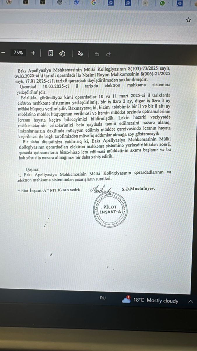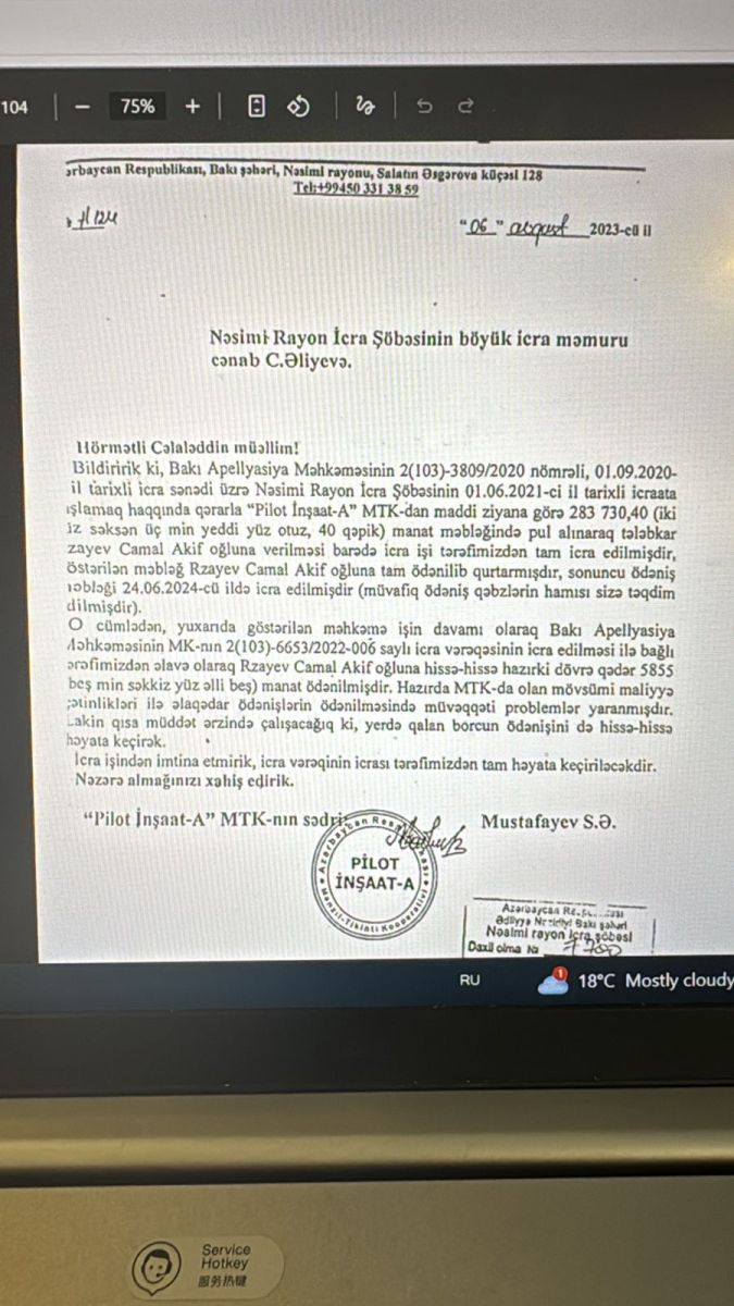 В ответ на наш запрос в министерстве сообщили, что согласно исполнительному документу от 1 сентября 2020 года, выданному Бакинским апелляционным судом, ООО «Pilot İnşaat-A» обязано возместить материальный ущерб путем взыскания различных сумм в пользу взыскателя - Рзаева Джамала Акиф оглу. Исполнительный документ поступил в производство исполнительного отдела 1 июня 2021 года, после чего в установленном порядке было начато исполнительное производство.