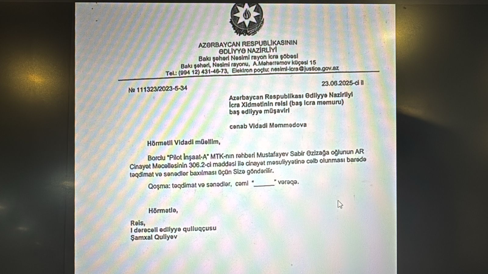 В министерстве подчеркнули: «В связи с неисполнением долга представление о привлечении руководителя компании к уголовной ответственности по статье 306.2 Уголовного кодекса Азербайджанской Республики было направлено в следственный орган по принадлежности. 1 сентября 2025 года Следственным управлением Министерства юстиции по факту неисполнения вступивших в законную силу решений суда возбуждено уголовное дело по статье 306.2 УК Азербайджанской Республики, и ведется следствие».